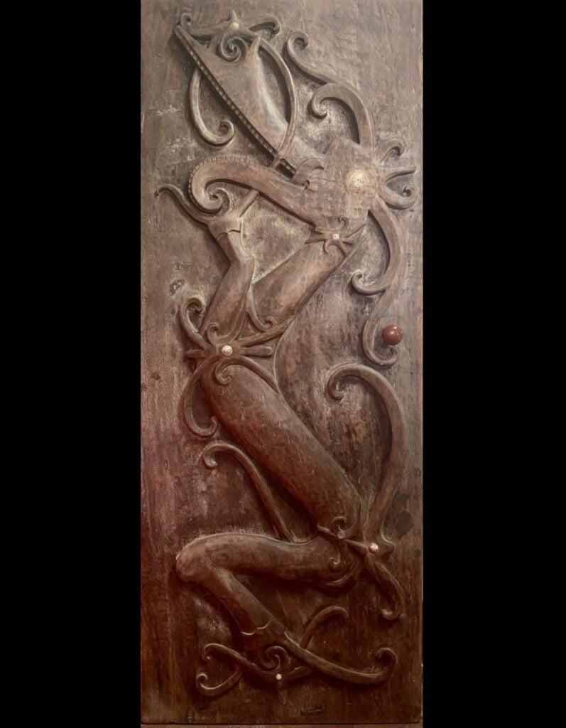 Additionally, members of the Dayak tribe have customary tattoos on their bodies that depict the Nabau Dragon. It can be a carved ironwood door or the head of a Mandau weapon handle, among other types of wood carving crafts. TAKALA curated one of the wooden door masterpieces with the 196 cm tall, 79 cm long, and 8 cm thick iron wood, carved an incredible Nabau dragon with a shimmer detail of shells in some spots to bring up a nice small accent. This remarkable one-piece wooden door came from an East Kalimantan house and is expected to have been around for decades.
