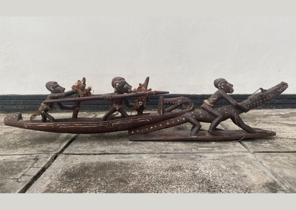 Since then, Deity Fumeripits has continued to wander the land of Papua from the shores of Arafura to the mountains of Jayawijaya. In each area he visited, Deity Fumeripits built longhouses “Yew” and created carved human-shaped statues. The statues come to life and dance when the tifa drum is played, and these new humans later became the ancestors of the present-day Asmat tribe. Traditional ceremonial facilities in the Asmat tribe still mostly consist of dances accompanied by tifa drums and wooden carvings of statues. In contrast to other local wood carving traditions, the Asmat carving art has persisted to the present day and has many distinctive qualities. Since there is no set design used when creating an Asmat carving, no two pieces are exactly alike. The most common themes used by Asmat tribe sculptors include the ancestors, the original ancient boat of the tribe (the wuramon), which serves as a symbol of the spirit boat that transports the ancestral spirits to the afterlife, as well as carvings of flora and fauna like cassowaries, bird of paradises, and various plant species.