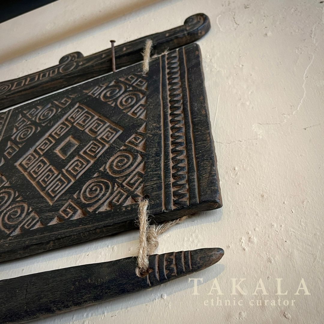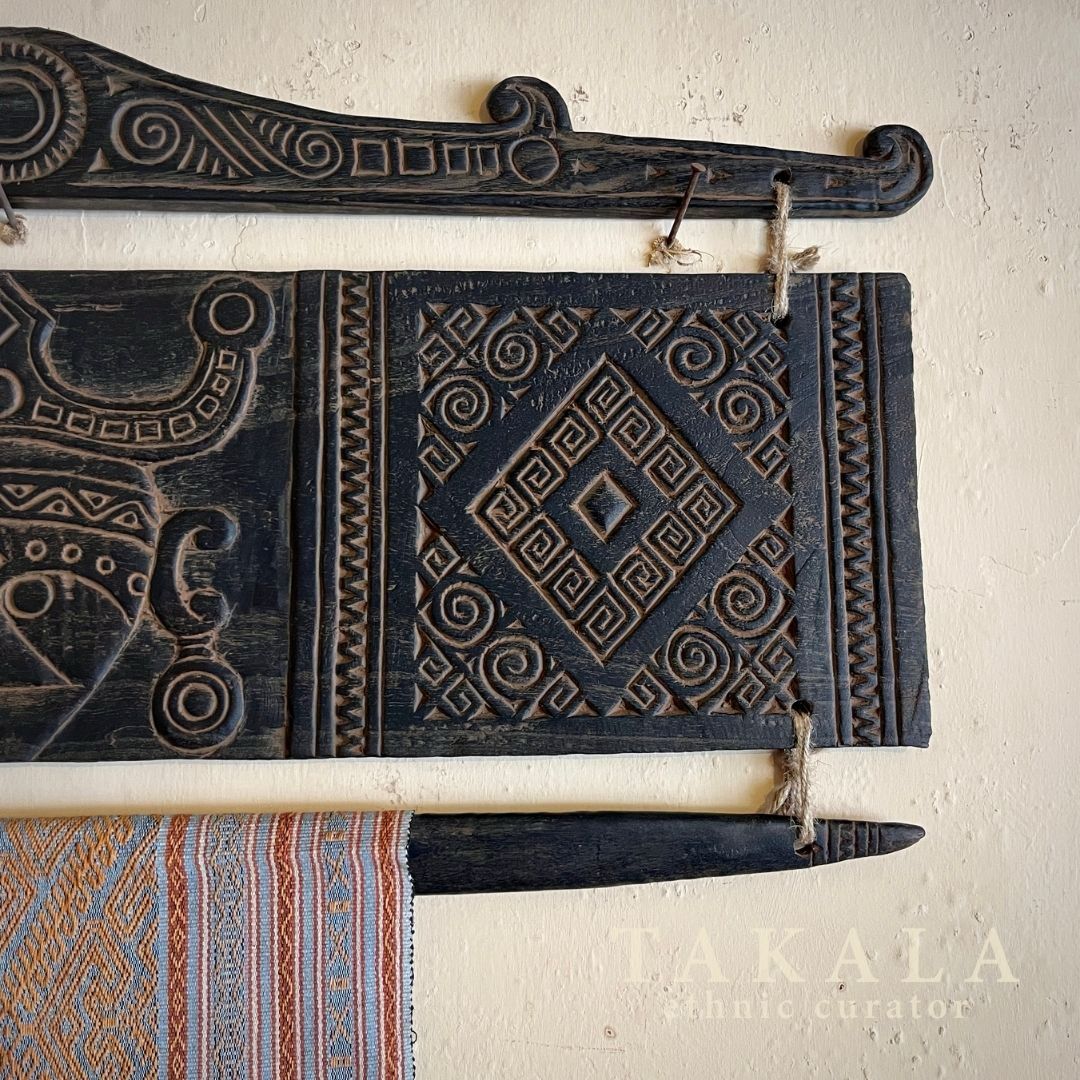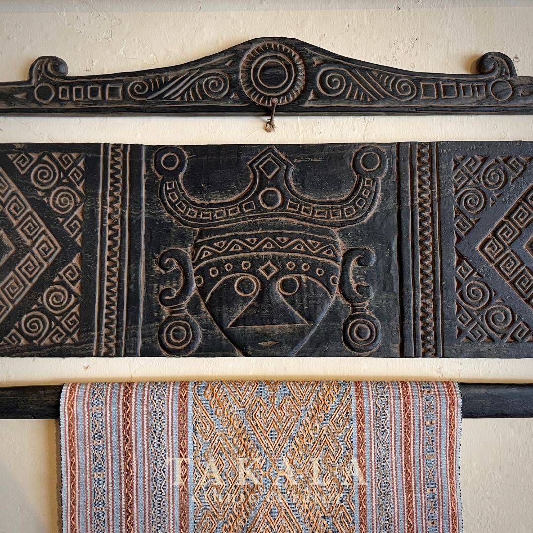 The wooden carving in the middle represents the ancestor. Ancestors play a significant influence on the people of Flores. Not only are religious ceremonies used to show respect for ancestors, but a picture in wood carvings and weaving are also made to remind people of the ancestors who have impacted their lives and served as role models. Diamond shape carving on the sides represent the weaving design all across eastern Indonesia.