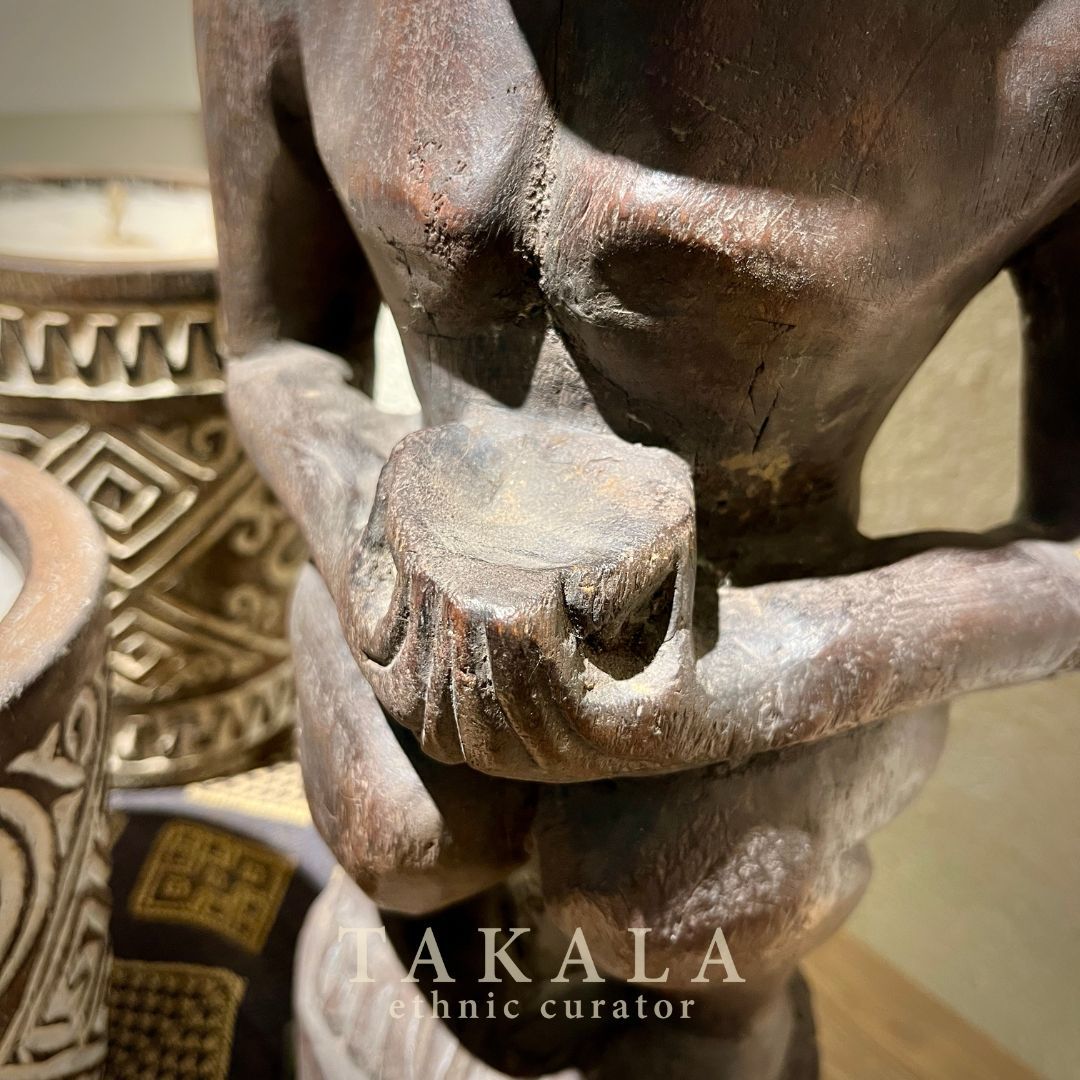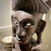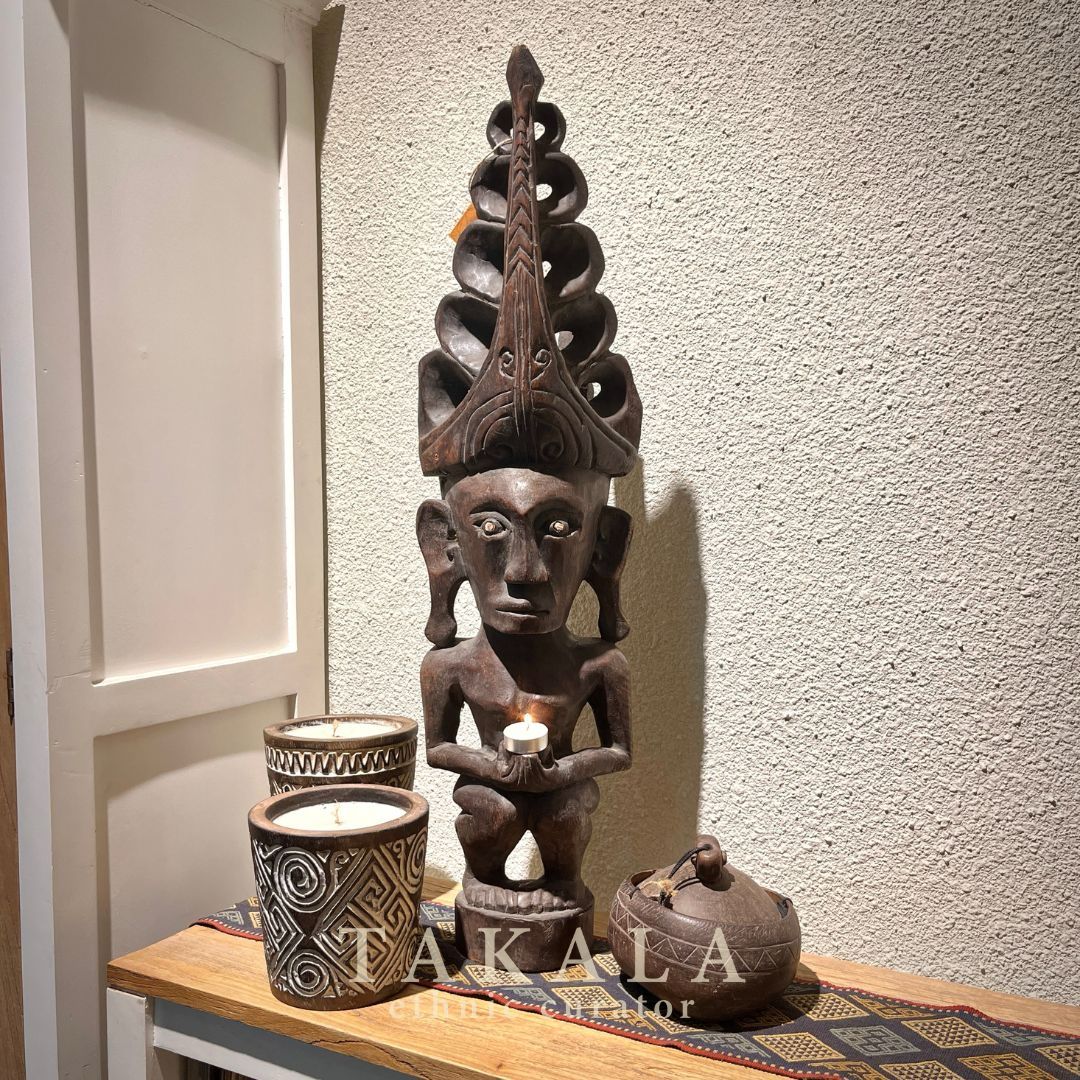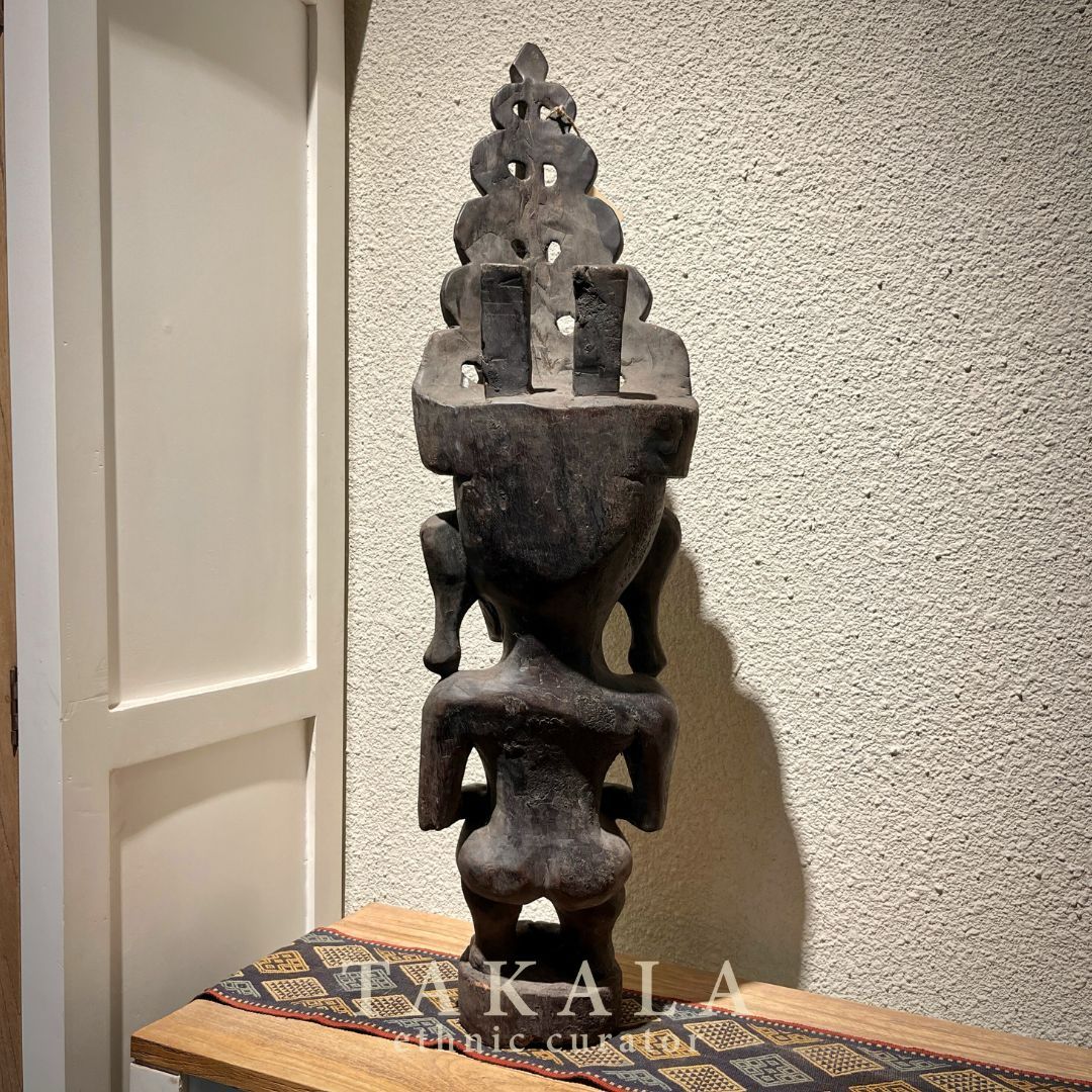 Siraha Salawa (also known as Siraha Omo) is a large, intricately carved wooden figure from Nias. In the Nias language, salawa means “chieftain,” while omo means “house.” The name Siraha Salawa literally translates as “chief deity image.” The figure represents the founding ancestor or chieftain of a household and serves as a spiritual protector of the home. During important ceremonies, offerings were placed in the small bowl held in its hands. These sculptures are finely polished and highly detailed, reflecting their sacred significance and embodying both ancestral authority and divine guardianship. Their presence within a home signified reverence for ancestors and a wish for protection, prosperity, and harmony.