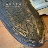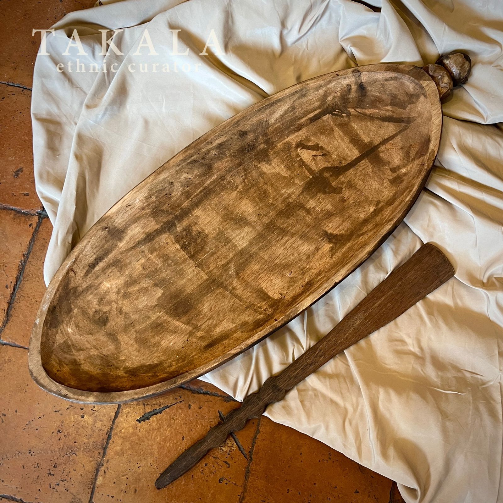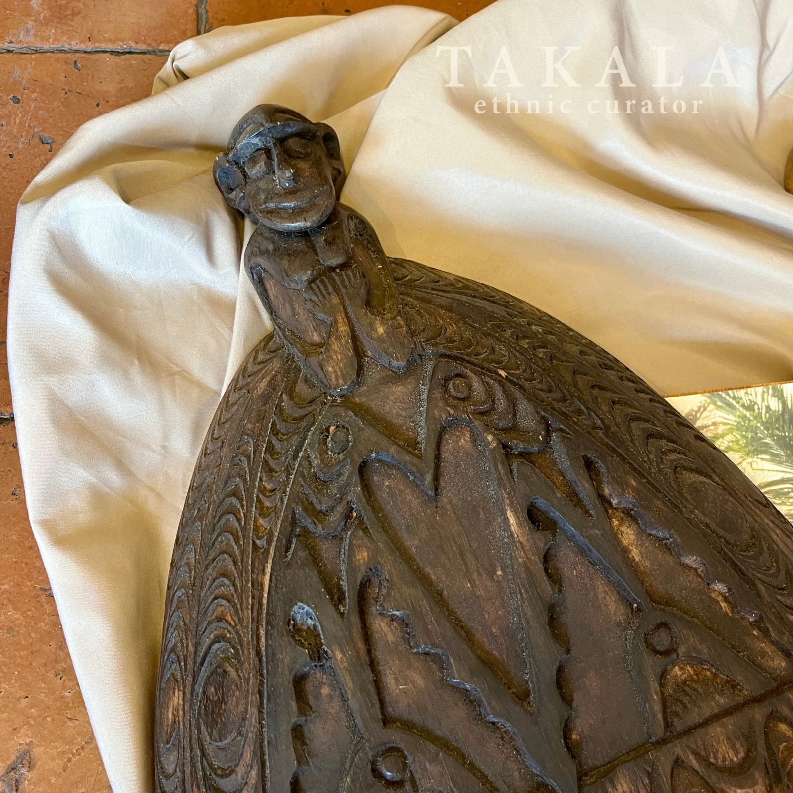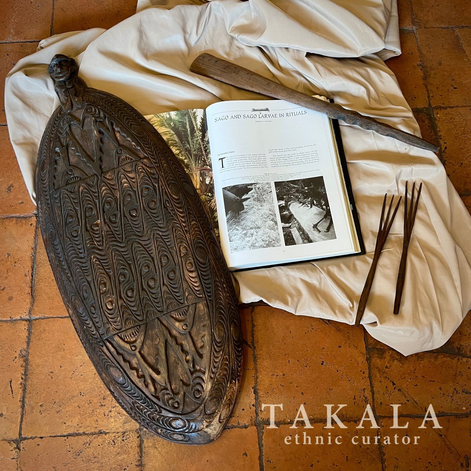 Sago Plates are commonly found in Asmat wood carving. This sago plate features the Yoniki motif, a traditional symbol of prestige among the Sentani people, with an ancestral figure carved at the top. The design consists of a central dot within a circle, representing the Ondofolo, the tribal leader who holds authority over customary governance. In the past, this sacred motif was exclusive to the Ondoafi, or head of the adat community, symbolizing power and leadership. Used during festivals and ceremonies, it often served to hold sago worms, symbolizing the transfer of ancestral power. In Asmat rituals, particularly in an ceremony, sago containers play a central role in fostering unity and reconciliation between families after a head hunting practice.