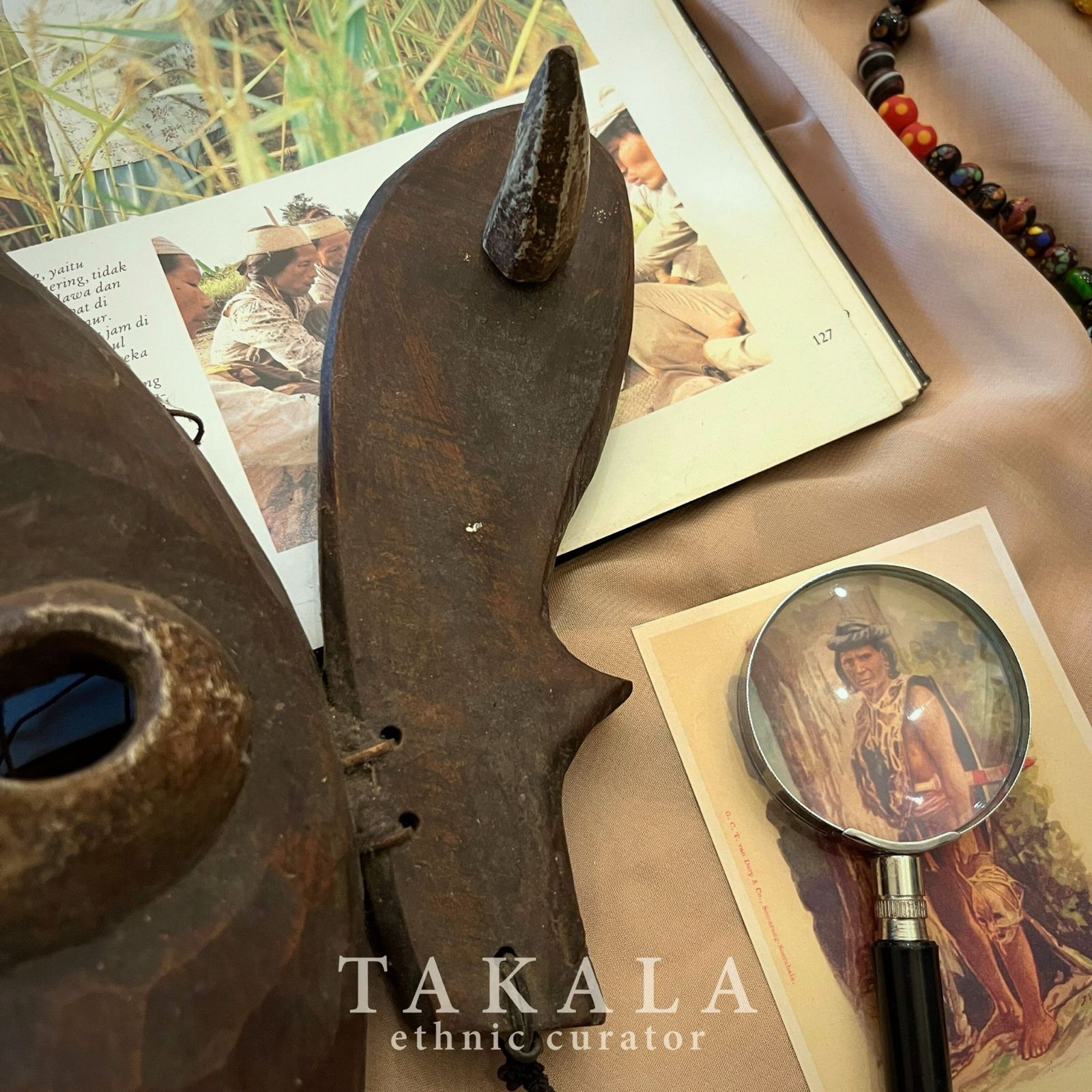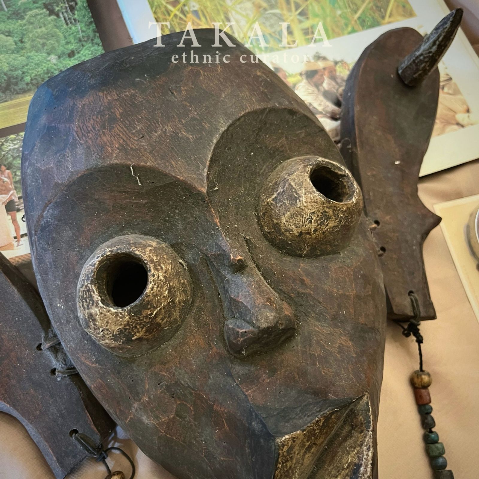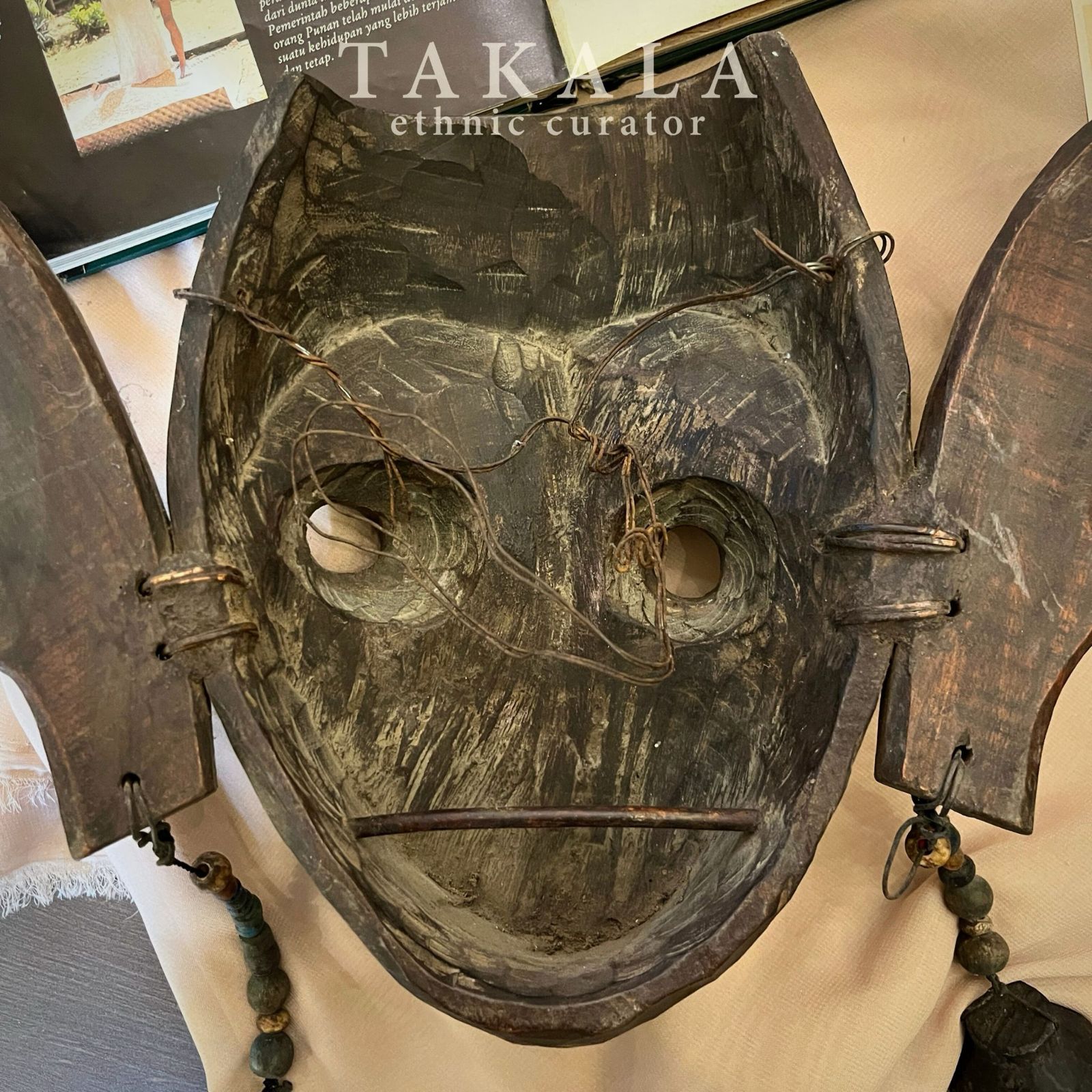Hudoq is a traditional ritual mask of the Dayak Bahau people from East Borneo. The name Hudoq means “incarnate,” referring to ancestral and sacred beings that descend to bless the earth with fertility. Worn in the Hudoq dance at the start of the planting season or after harvest to drive away crop pests, ask for protection, and give thanks to the ancestral spirits. Mostly, the masks depict a combination of pests and harmful animals that threaten rice crops, such as birds and pigs.This one symbolises human faces representing Dayak ancestors. This particular mask is also an older version, showing large pendulous earrings and natural earth pigments rather than modern paints.
