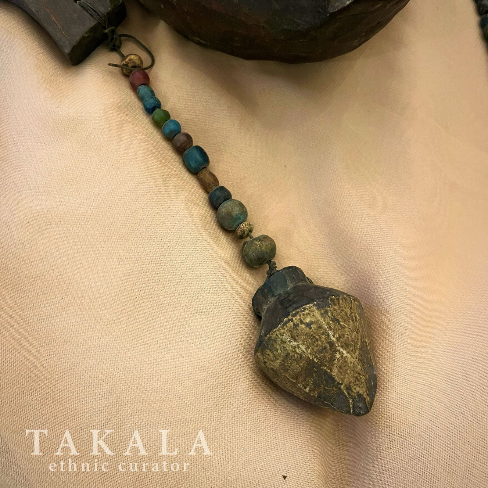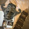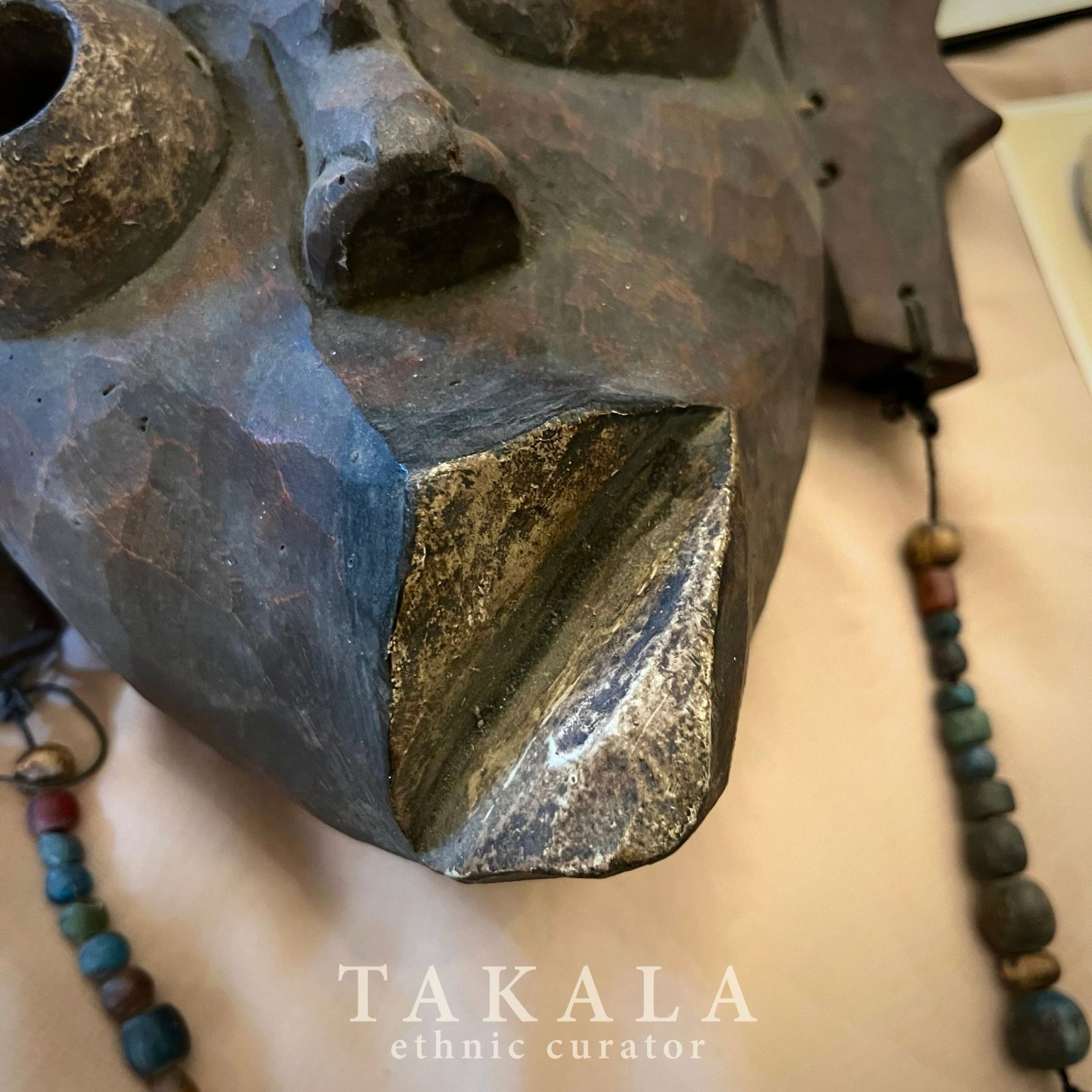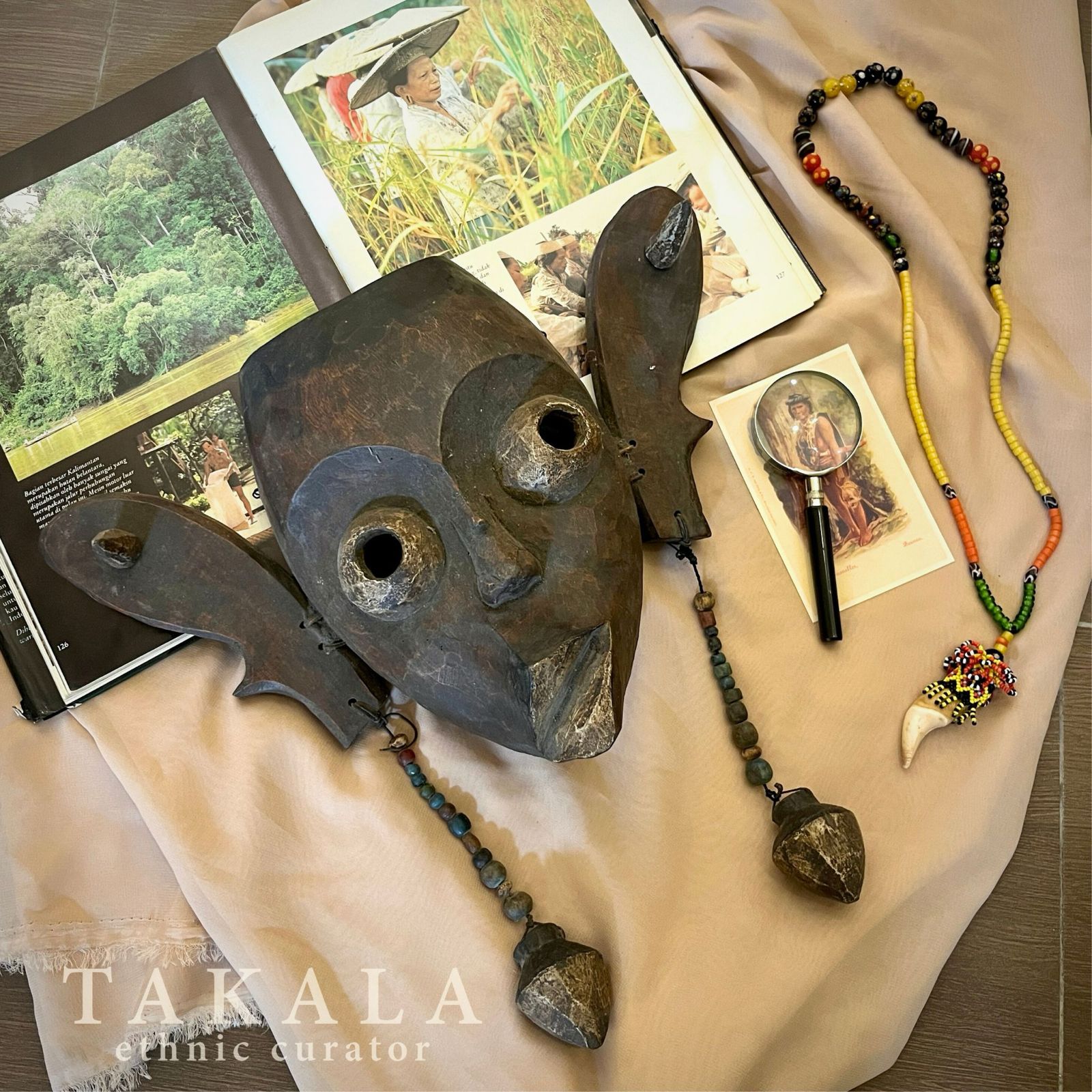 Hudoq is a traditional ritual mask of the Dayak Bahau people from East Borneo. The name Hudoq means “incarnate,” referring to ancestral and sacred beings that descend to bless the earth with fertility. Worn in the Hudoq dance at the start of the planting season or after harvest to drive away crop pests, ask for protection, and give thanks to the ancestral spirits. Mostly, the masks depict a combination of pests and harmful animals that threaten rice crops, such as birds and pigs.This one symbolises human faces representing Dayak ancestors. This particular mask is also an older version, showing large pendulous earrings and natural earth pigments rather than modern paints.