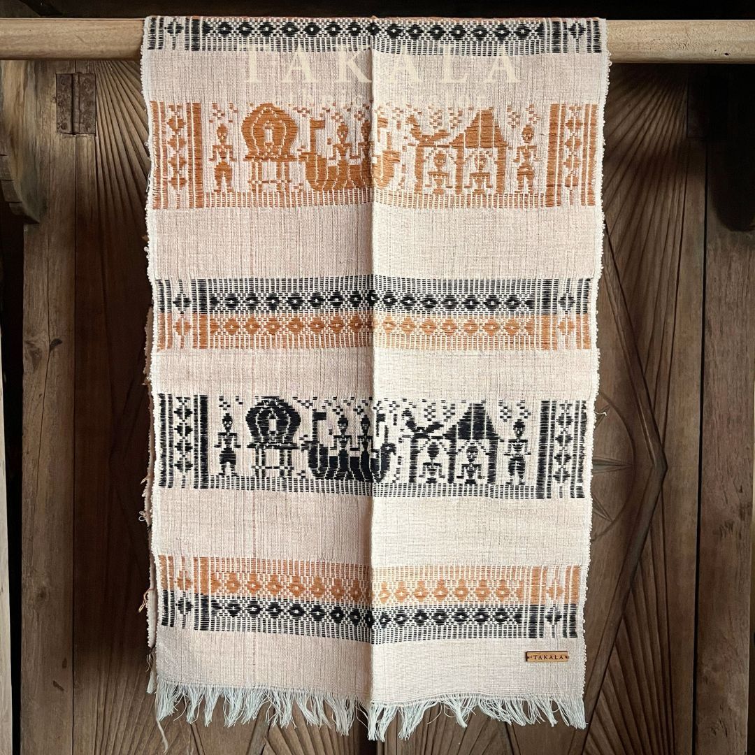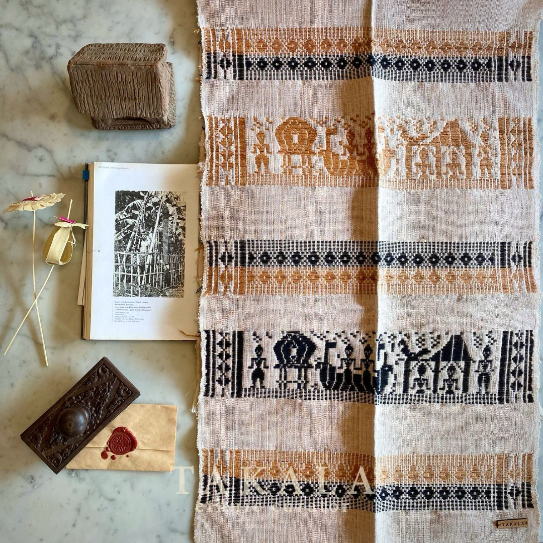 This woven textile tells the story of Sade Village and the cultural significance of Lombok. For generations, the eastern region of Lombok was known as one of the finest boat-building centers, and this heritage is woven into the textile’s motifs. You can also see the Bale, the traditional Sasak house, represented as a key symbol. The people depicted are the Sasak tribe, who have lived in Sade Village for around 15 generations, preserving their traditions and way of life. Textiles have long been an important part of Lombok culture.The material remains entirely natural and the colors come from traditional dyeing techniques: light brown from coconut husk, deep blue from tamarind, and black from tree bark. Every piece is created using a manual backstrap loom, a weaving method passed down through generations.