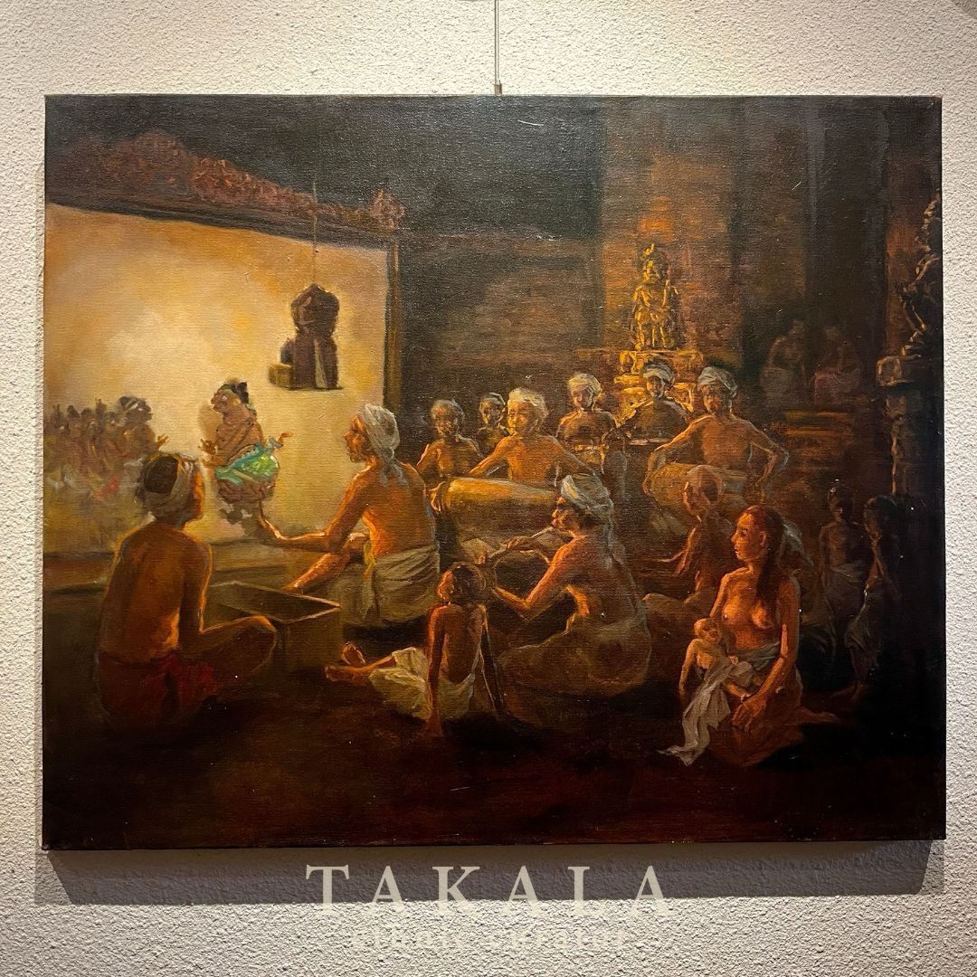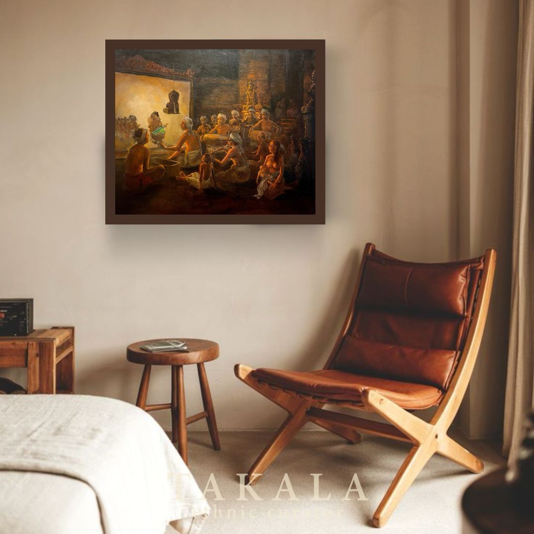 This oil painting depicts the atmosphere behind a traditional Balinese Wayang performance. Set in a dimly lit room, the warm tones of the painting evoke the golden glow of oil lamps, casting light on the dalang (puppet master) and his accompanying gamelan musicians. At the center, the dalang skillfully manipulates a puppet, his concentration mirrored by the attentive faces of the performers and spectators surrounding him. Men play traditional instruments, while women and children sit close by, absorbed in the unfolding story. The artist, Didit Riyadi, masterfully captures the harmonious blend of devotion, art, and community that defines Balinese Wayang as both a cultural and spiritual experience.