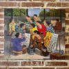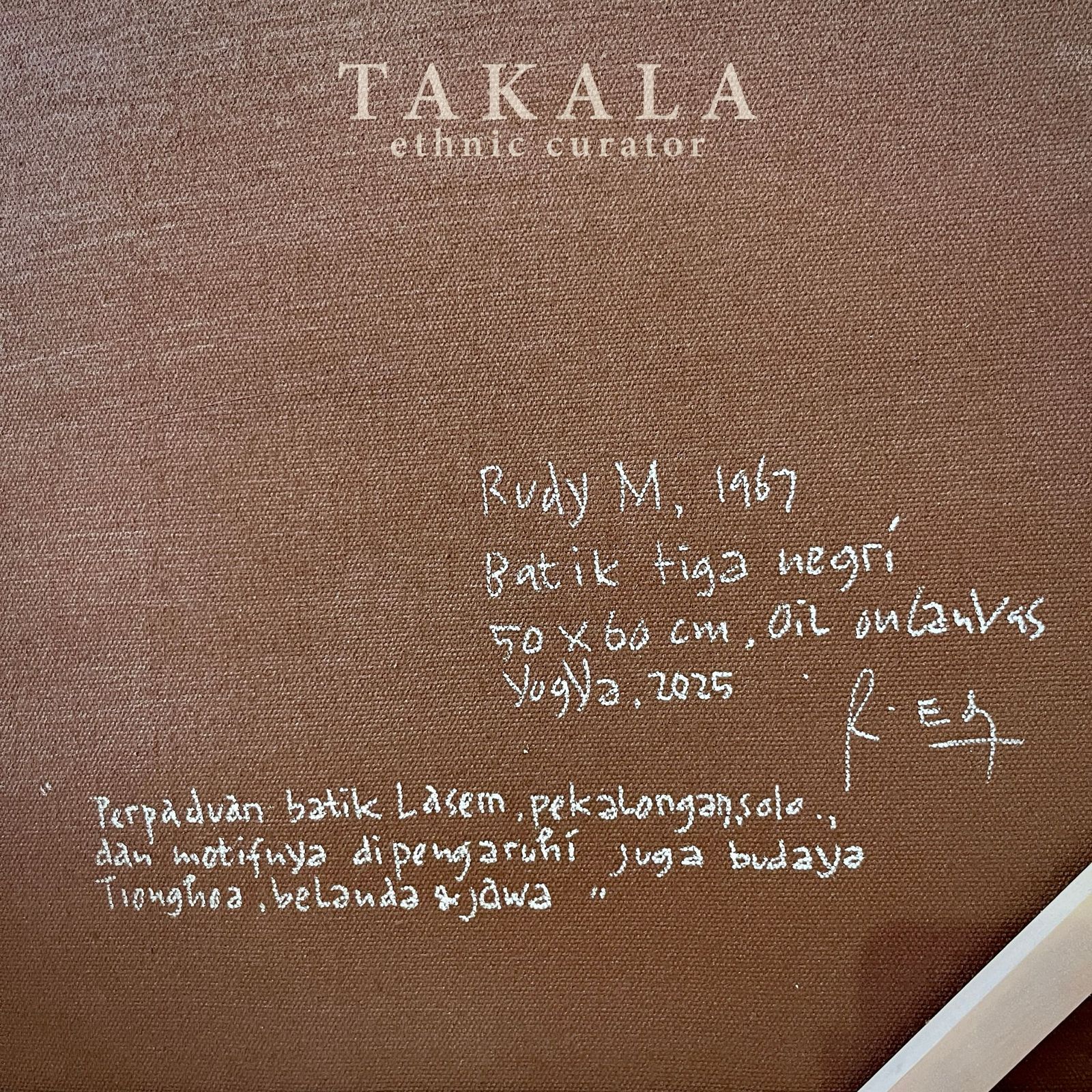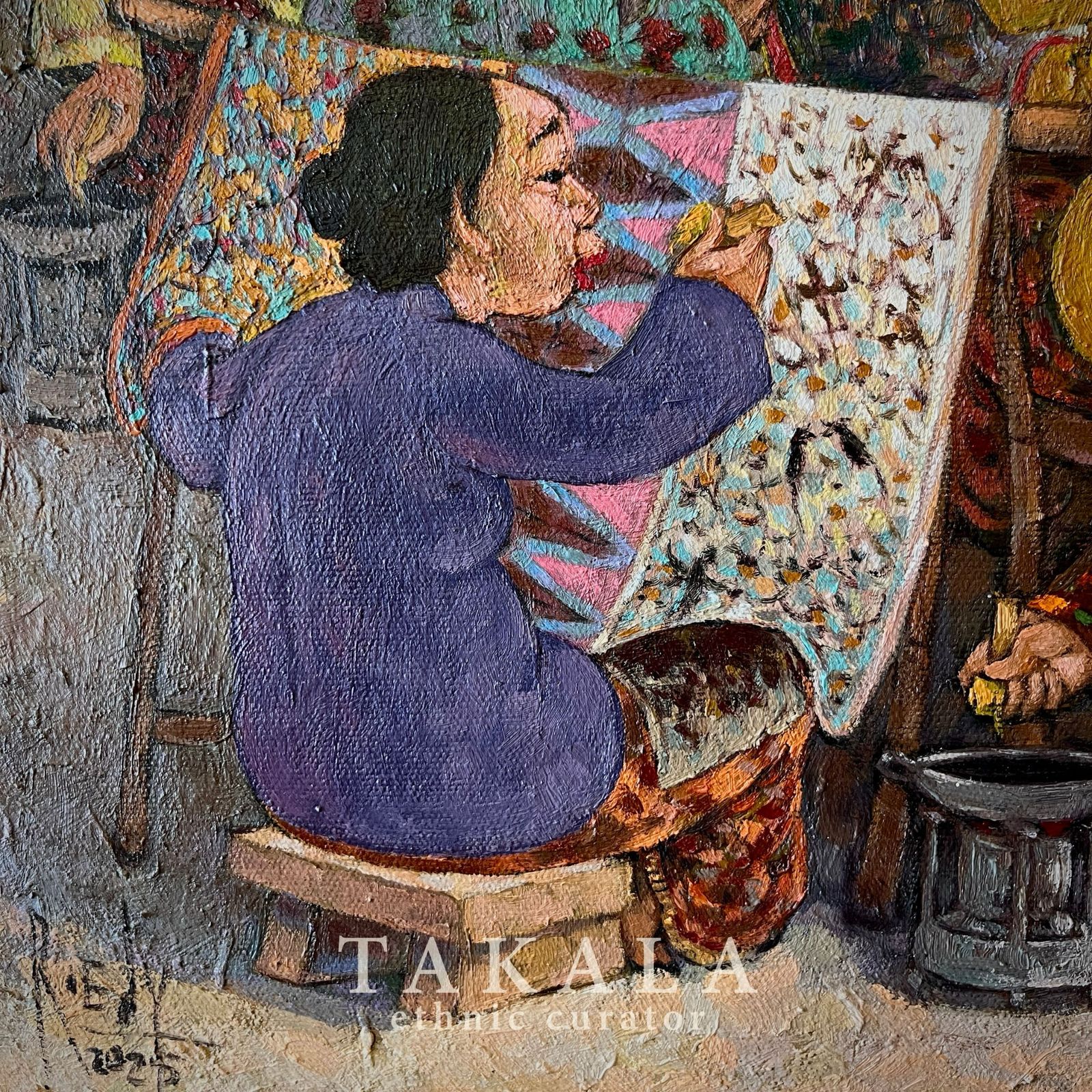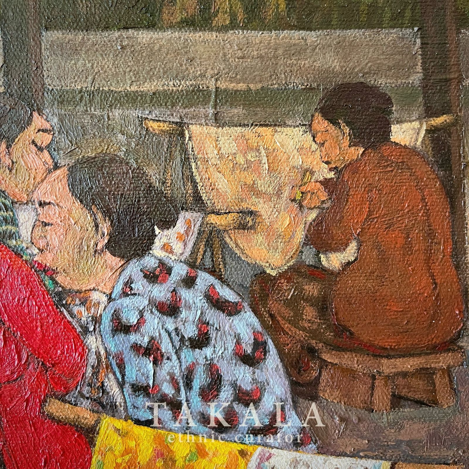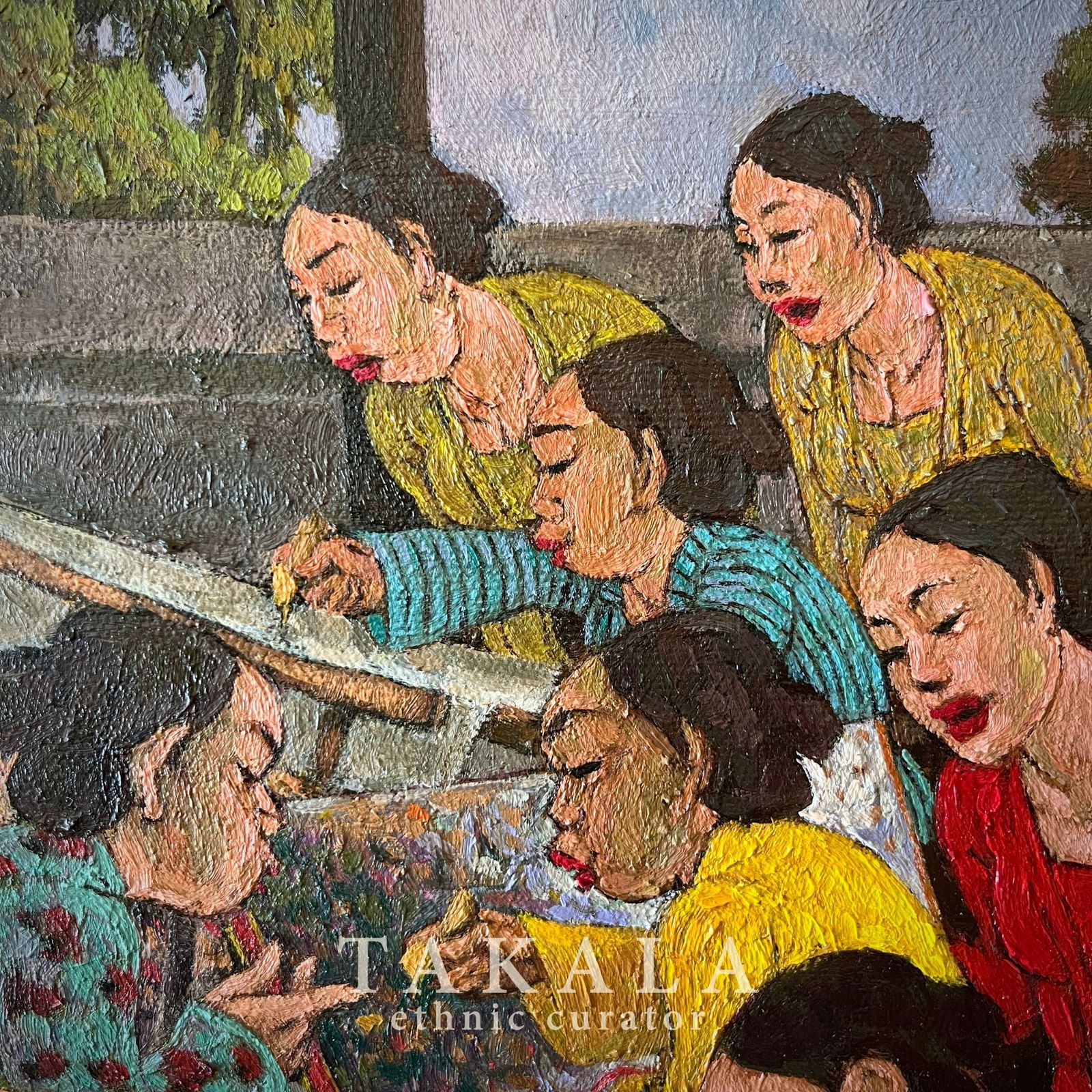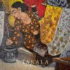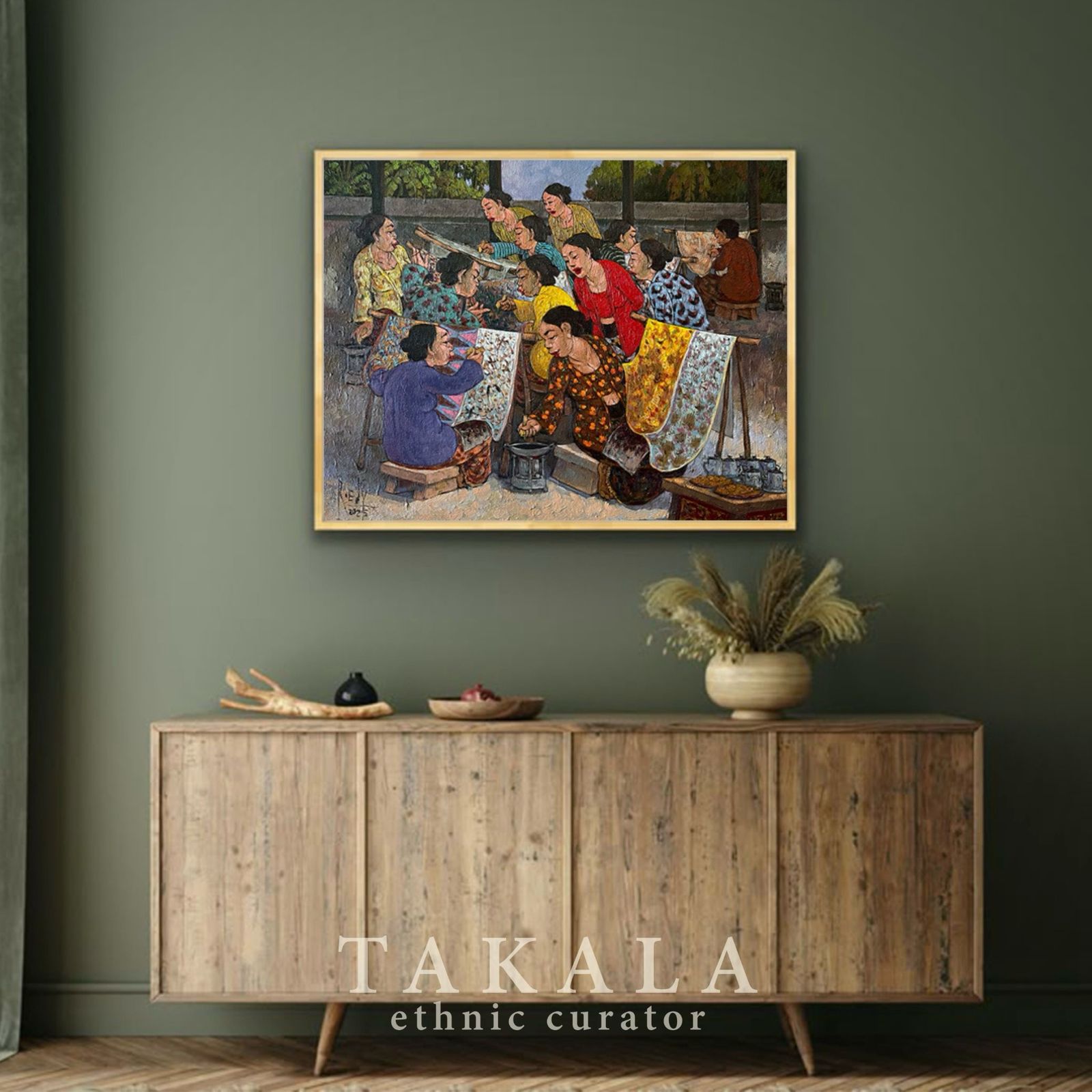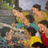 Batik Tiga Negri portrays the rich tradition of batik-making, highlighting the fusion of styles from three significant batik-producing regions in Indonesia: Lasem, Pekalongan, and Solo. The painting captures a vibrant batik workshop, where women are deeply engaged in the canting process—applying hot wax to fabric using a traditional pen-like tool. The vibrant fabrics on display reflect the diverse cultural influences that shape batik motifs, Chinese, Dutch, and Javanese elements are intricately blended into the design. The dynamic interaction among the women suggests a shared knowledge and collective effort in maintaining the heritage of batik.