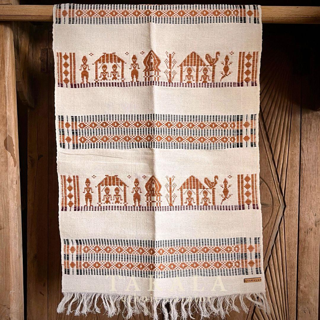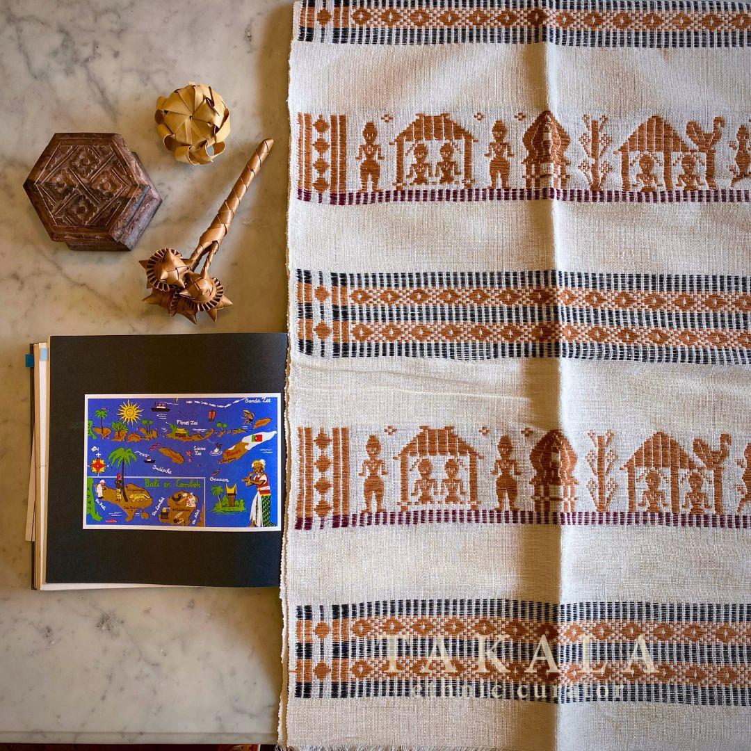 This woven textile tells the story of the Sasak people of Lombok, featuring the Bale, the traditional Sasak house, as a central symbol of home and continuity. The figures represent the Sasak community, who have lived in the village for around 15 generations, preserving their traditions and way of life. Textiles have long played an important role in Lombok’s cultural identity. Made entirely from natural materials, the colors come from traditional dyes: light brown from coconut husk and black from tree bark.. Each piece is handwoven on a manual backstrap loom. Compared to textiles from Sade Village that mainly use cotton, weavings from Sukarara Village often use banana or pineapple fiber as the base material, giving them a slightly rougher texture and highlighting the diversity within Sasak weaving traditions.