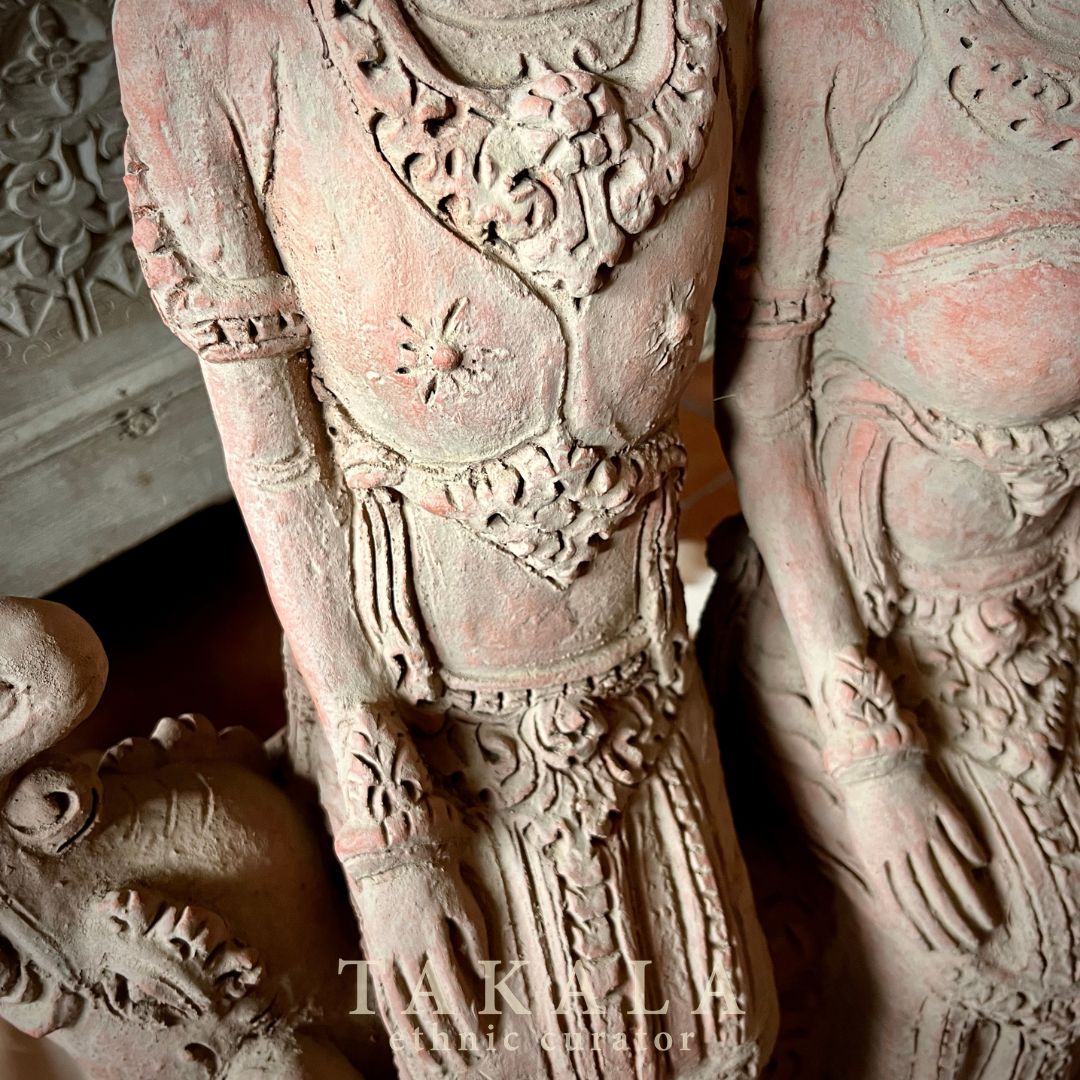 This Loro Blonyo figure is inspired by the royal wedding attire of the Majapahit Kingdom. In Javanese tradition, Loro Blonyo represents the ideal union of husband and wife, symbolizing harmony, balance, and lasting prosperity within the household. The bride and groom sit gracefully on an elephant carved bench, with each figure positioned on the left and right, reflecting balance and partnership in married life. Their attire recalls the refined aesthetics of Majapahit court dress, evoking the dignity and sacred meaning of a royal marriage. Crafted from terracotta in Mojokerto, the historical heartland of Majapahit, the sculpture connects contemporary craftsmanship with the legacy of one of Java’s greatest kingdoms.
