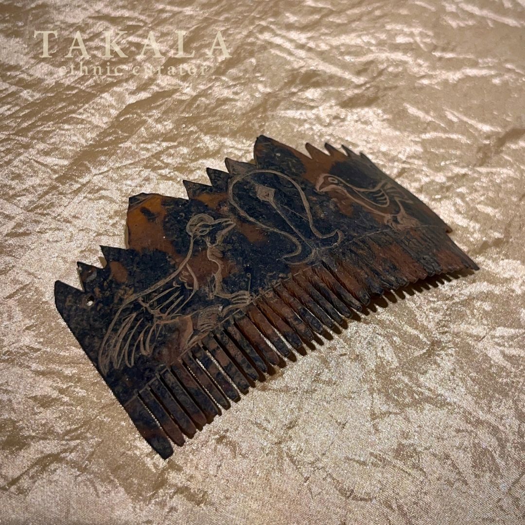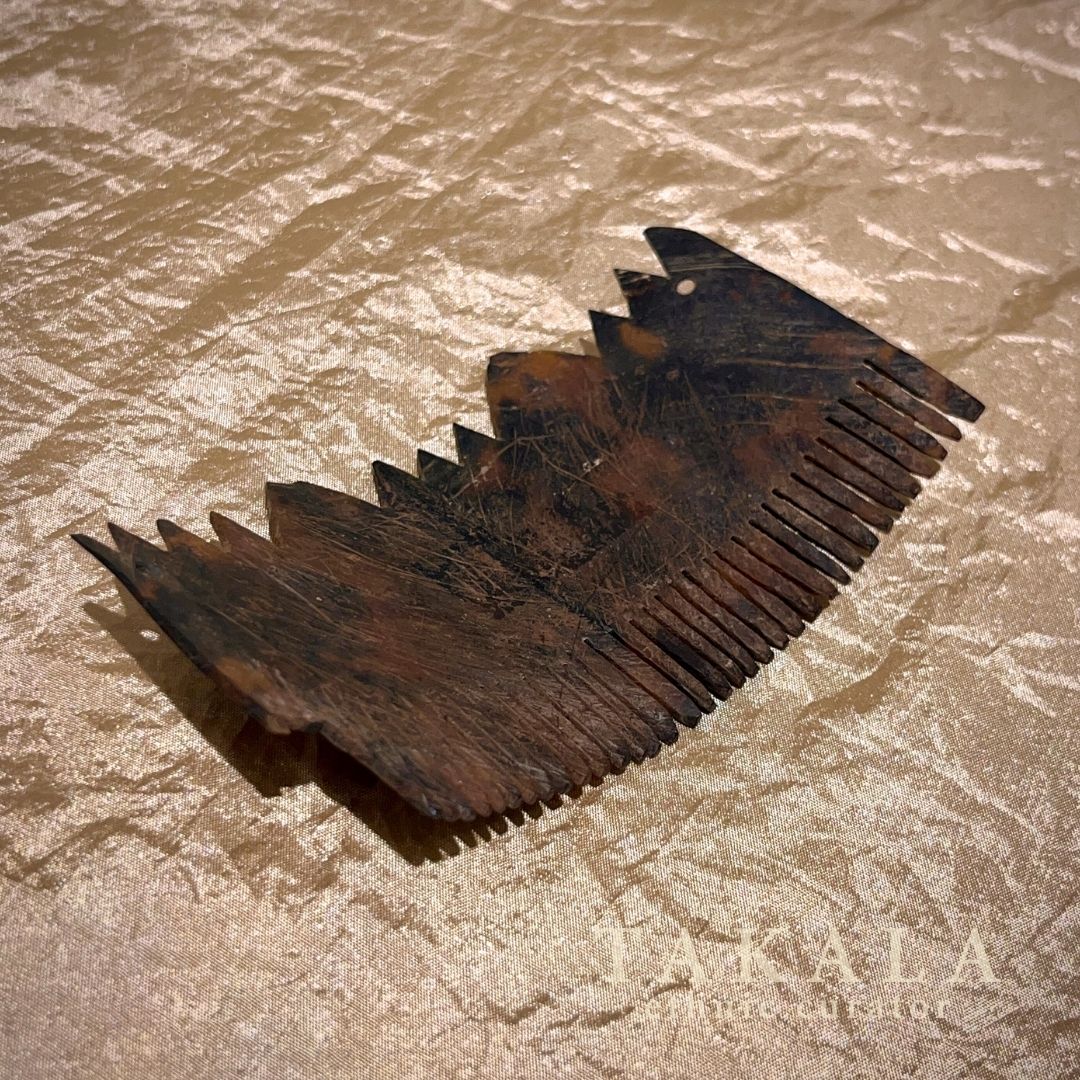 Haikara is a traditional hair comb from Sumba, crafted from tortoise shell and worn as part of aristocratic attire. It functions both as a hair accessory and a symbol of status and heritage. In Sumbanese culture, the tortoise shell, known as tanoma, is associated with noble lineage and high social standing. Traditionally, a Haikara was gifted by fathers to their daughters upon reaching puberty, marking their transition into adulthood and readiness for marriage. This piece features carved Manu motifs of a rooster, symbolizing awareness and vigilance, with the Mamuli motif at the center representing fertility, womanhood, and the continuity of life.