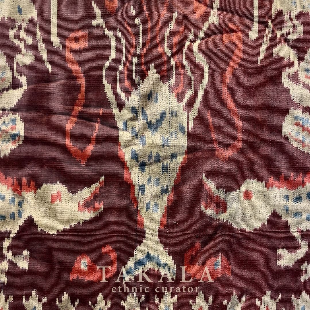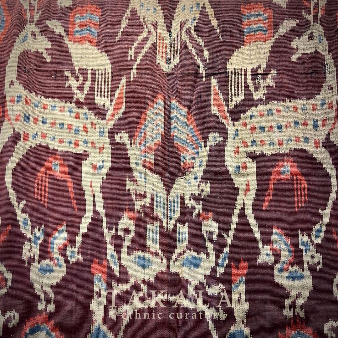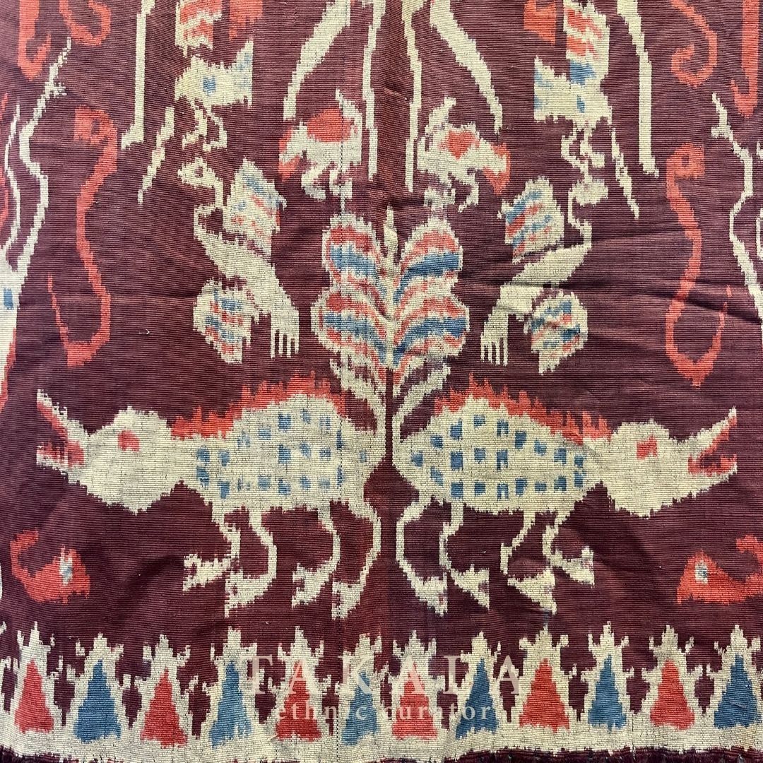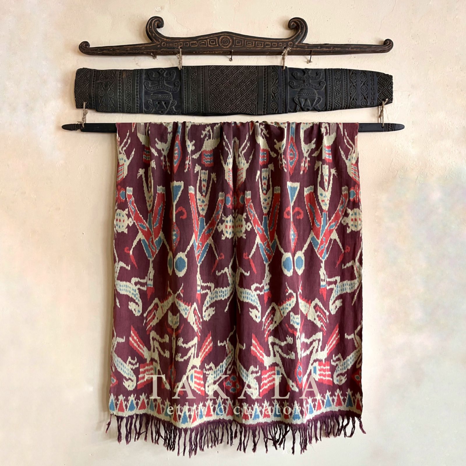Kombu, the red woven fabric from Sumba, features prominent motifs such as Tau Rianja, representing dancing humans, and Pasola, depicting men on horseback. The dancing human signifies the imminent arrival of rain, symbolizing fertility for the land. Meanwhile, Pasola stands as the crucial yearly ritual in Sumba, occurring before the commencement of the rice planting season. This event consists of a simulated yet fierce battle among horse-riding men who engage in spear-throwing contests. Other figures that are incorporated into this ikat weaving include Rahu (Deer), Kurangu (Lobster), Ularu (Snake), Wuya (Crocodile), Karawulang (Turtle), and Manu (Rooster), which are typical motifs from Kambera, East Sumba.