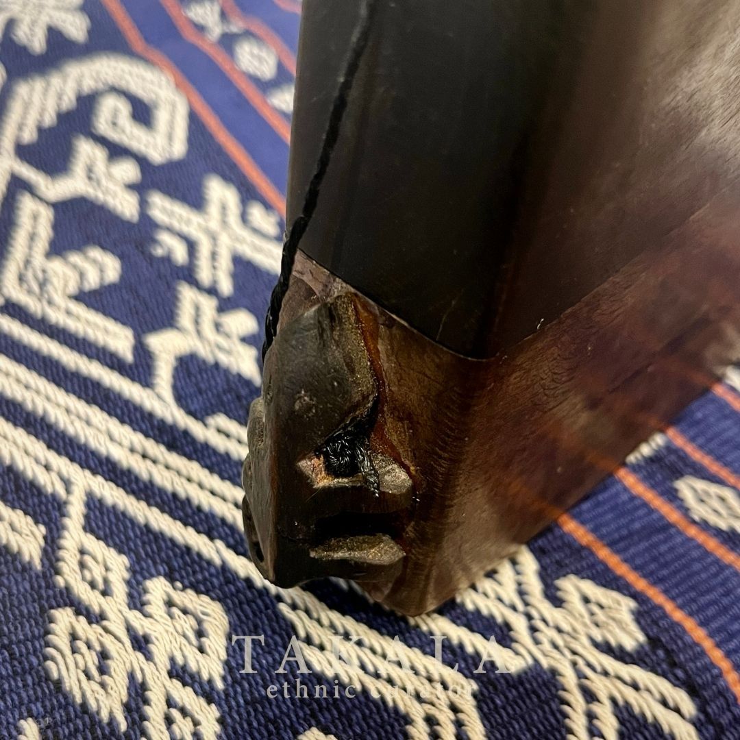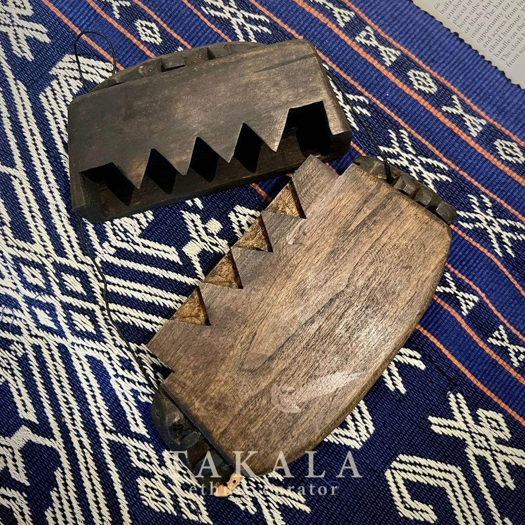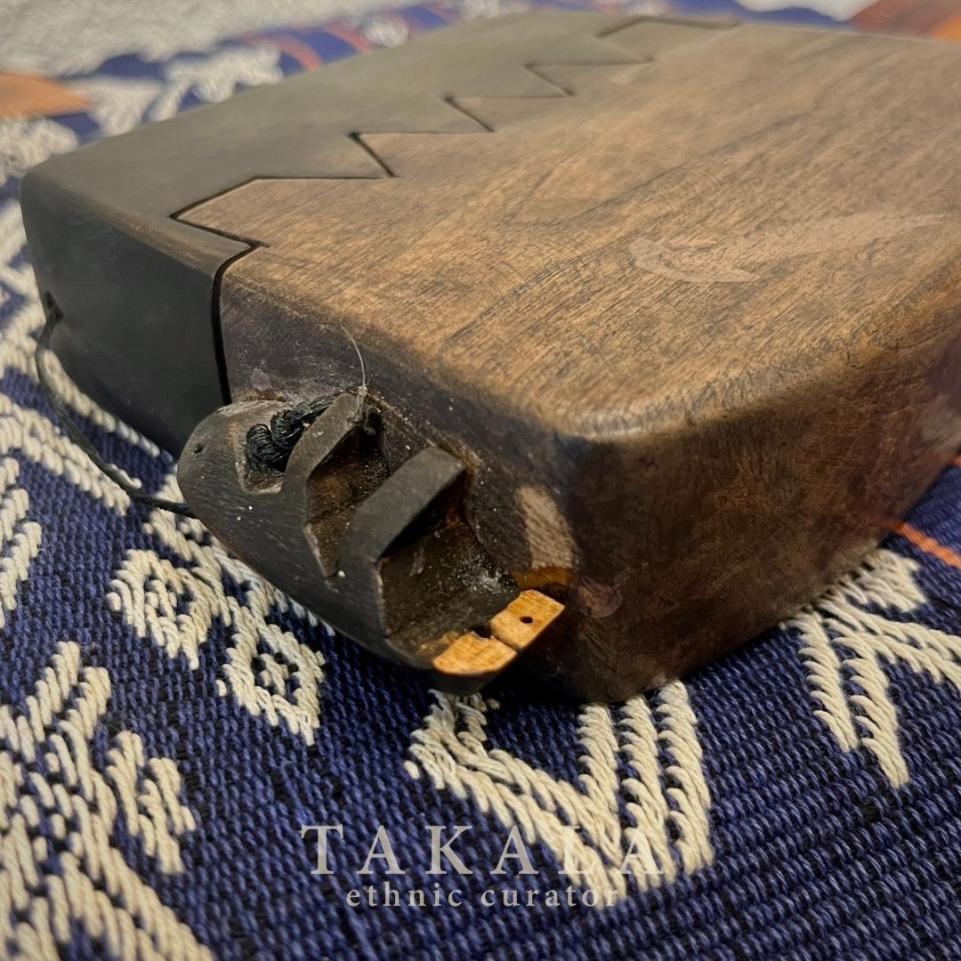 The tongal is a wooden pouch worn by men in Sumba and is an important part of traditional male clothing. It reflects Sumba’s long tradition of woodcarving craftsmanship. Worn tied around the waist, the tongal is used to carry small valuable items such as money, tobacco, lime, and traditional ear ornaments that are highly respected in Sumbanese culture (mamuli). Lizard-like carvings appear on the top and sides of the pouch, reflecting Sumba beliefs in ancestral guardianship and the connection between the visible and unseen worlds.