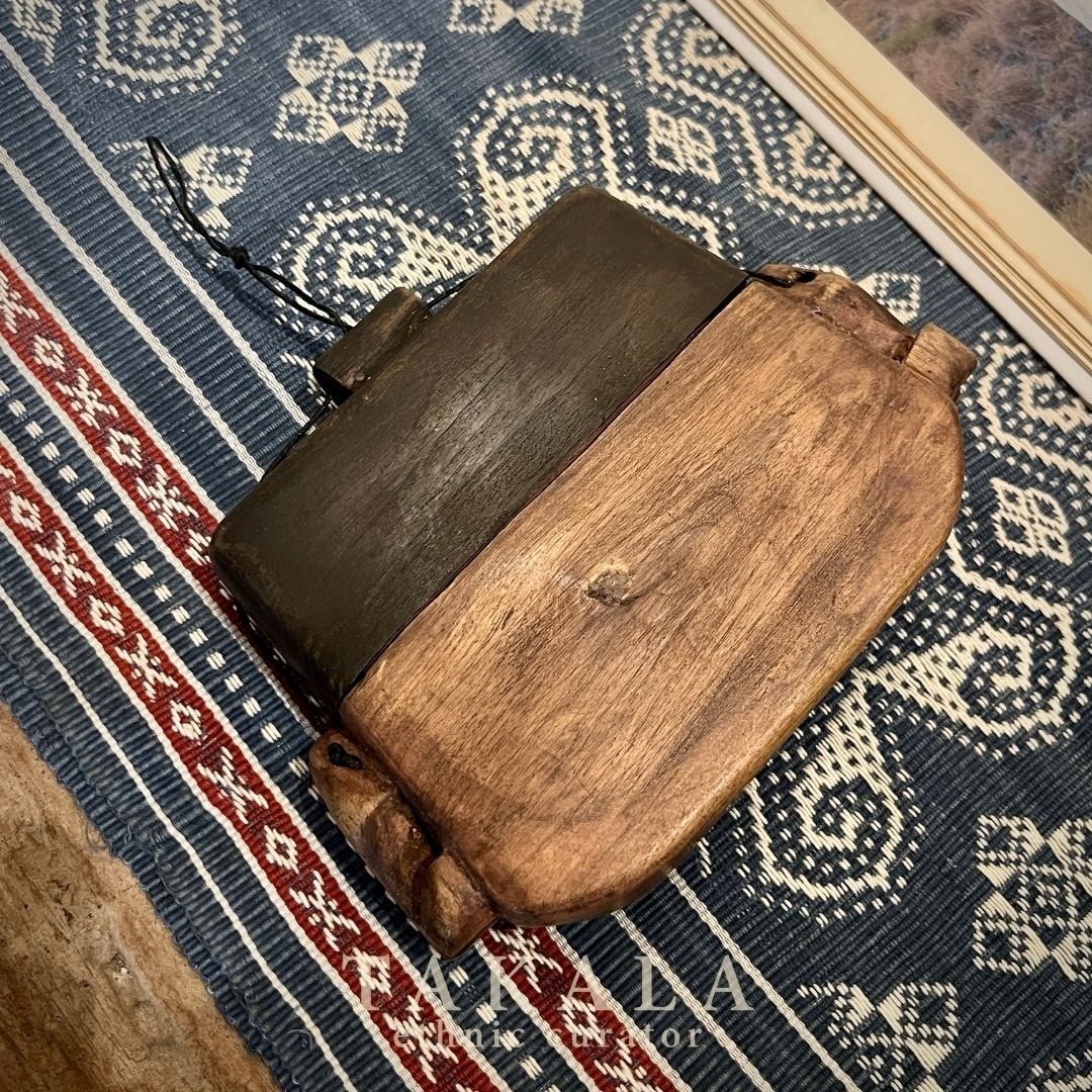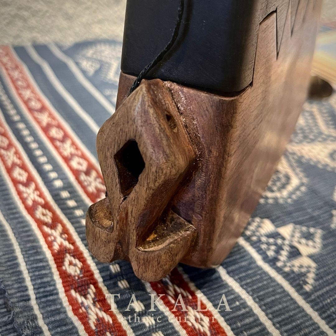 The man’s wooden pouch, known as a tongal, is a fine example of traditional Sumba woodcarving and an essential element of male ceremonial dress. Worn knotted at the waist, the tongal carries money, tobacco, lime, and other treasured personal items, including the revered ear ornaments known as mamuli. Carved along the sides of this tongal, the mamuli motif represents women as life givers; its form echoes the female reproductive organ and symbolizes fertility, continuity, and the balance between masculine and feminine forces in Sumba culture.