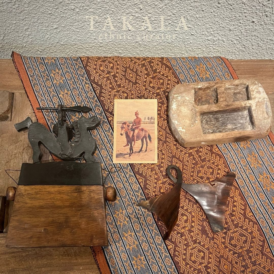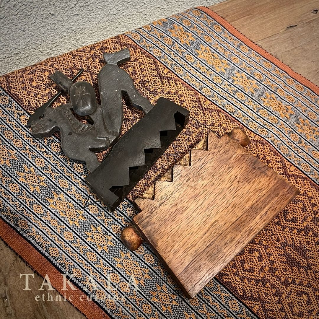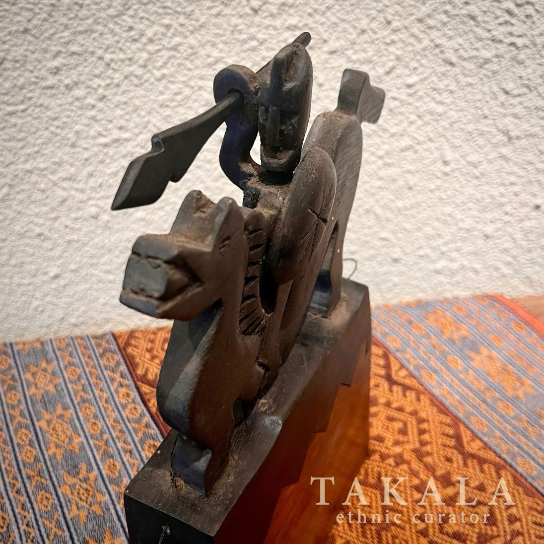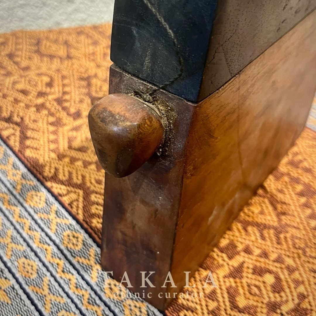 Tongal is a wooden pouch worn by men and is an important part of traditional clothing in Sumba. It represents the region’s rich woodcarving tradition. Worn tied around the waist, the tongal is used to store small valuable items such as money, tobacco, lime, and mamuli, respected traditional ear ornaments. This particular tongal is decorated with a carved figure of a person riding a horse and holding a spear-like weapon, possibly referring to Pasola, a traditional horseback ritual involving spear throwing that symbolizes bravery and respect for ancestors.