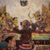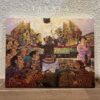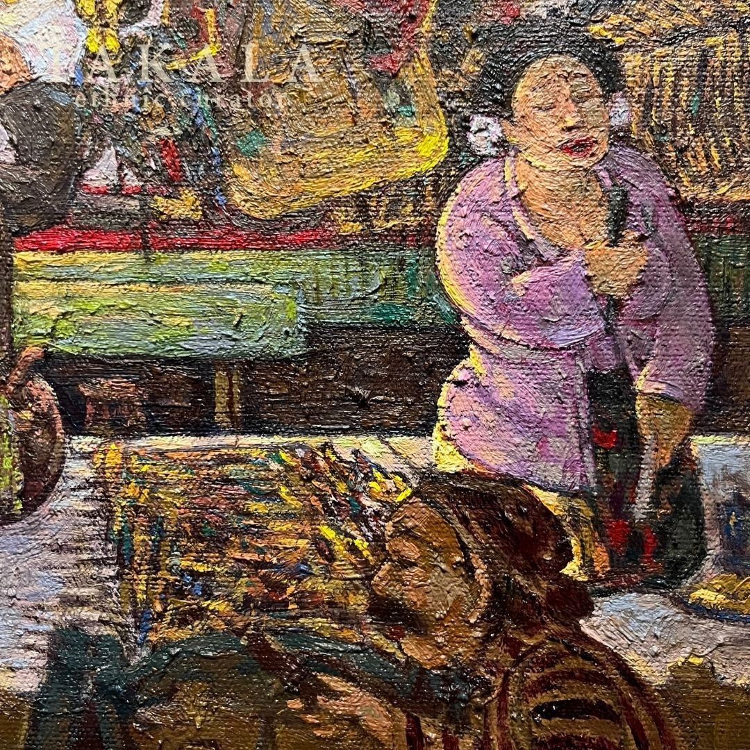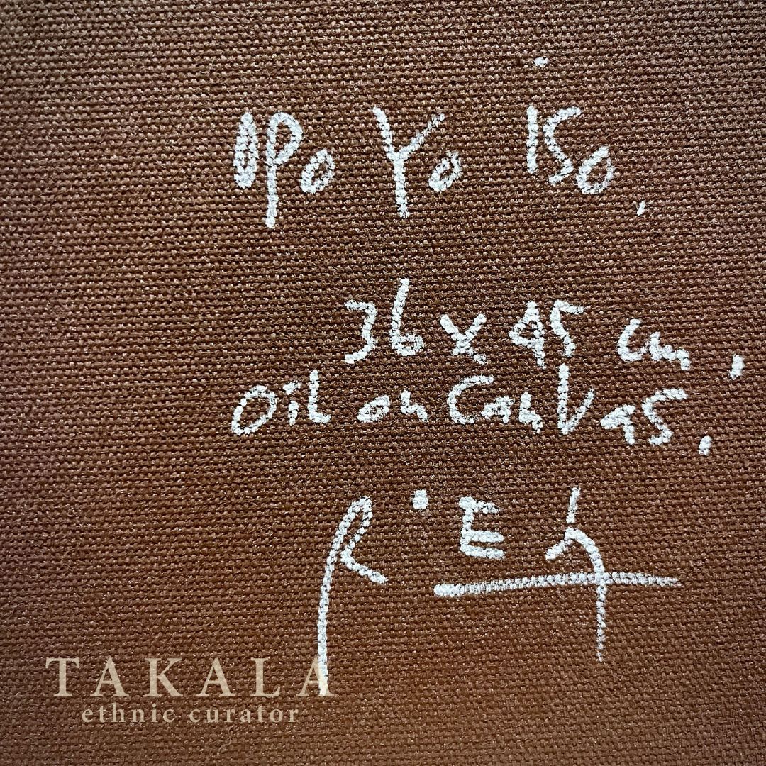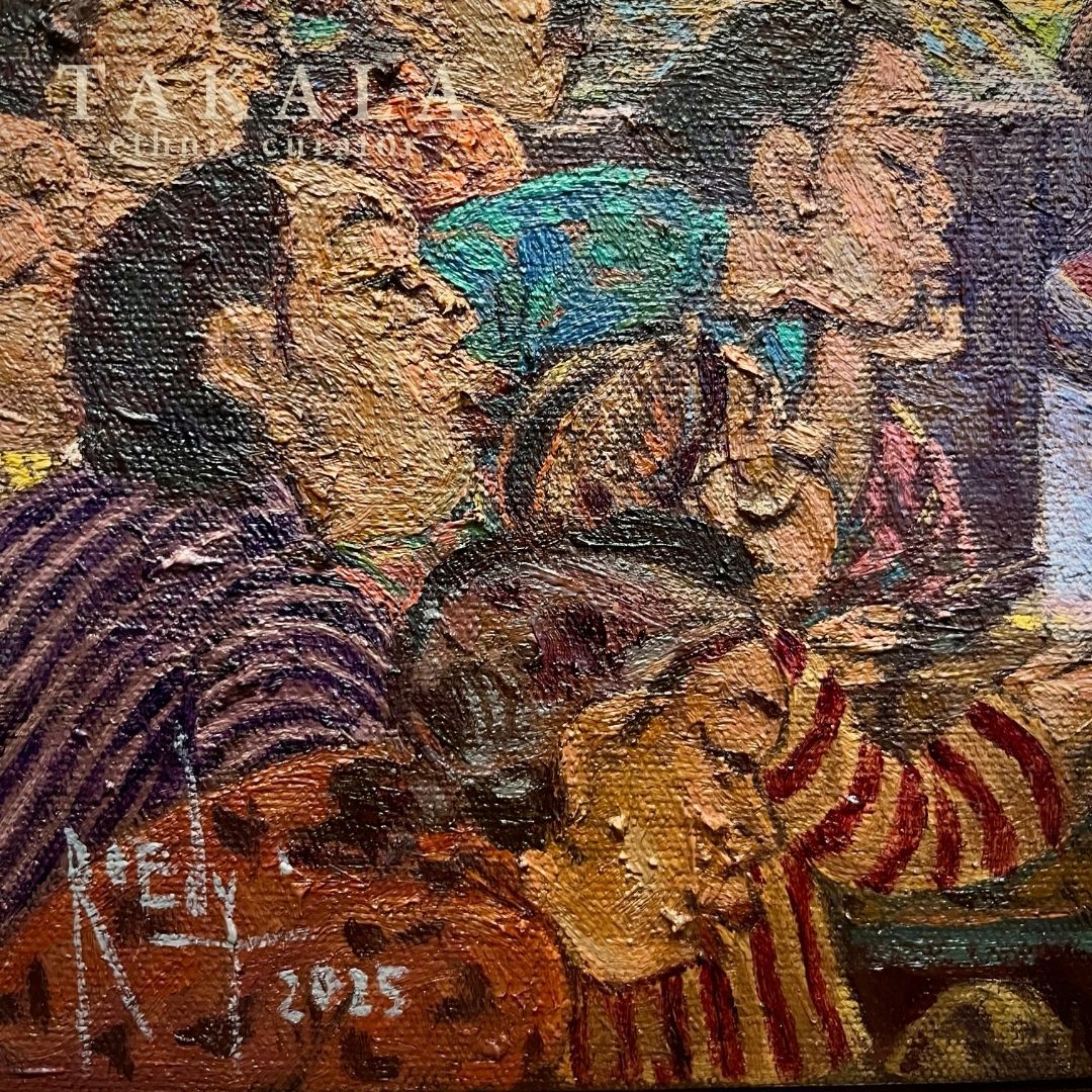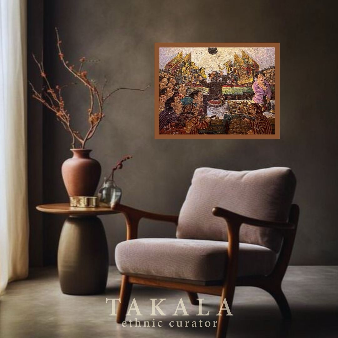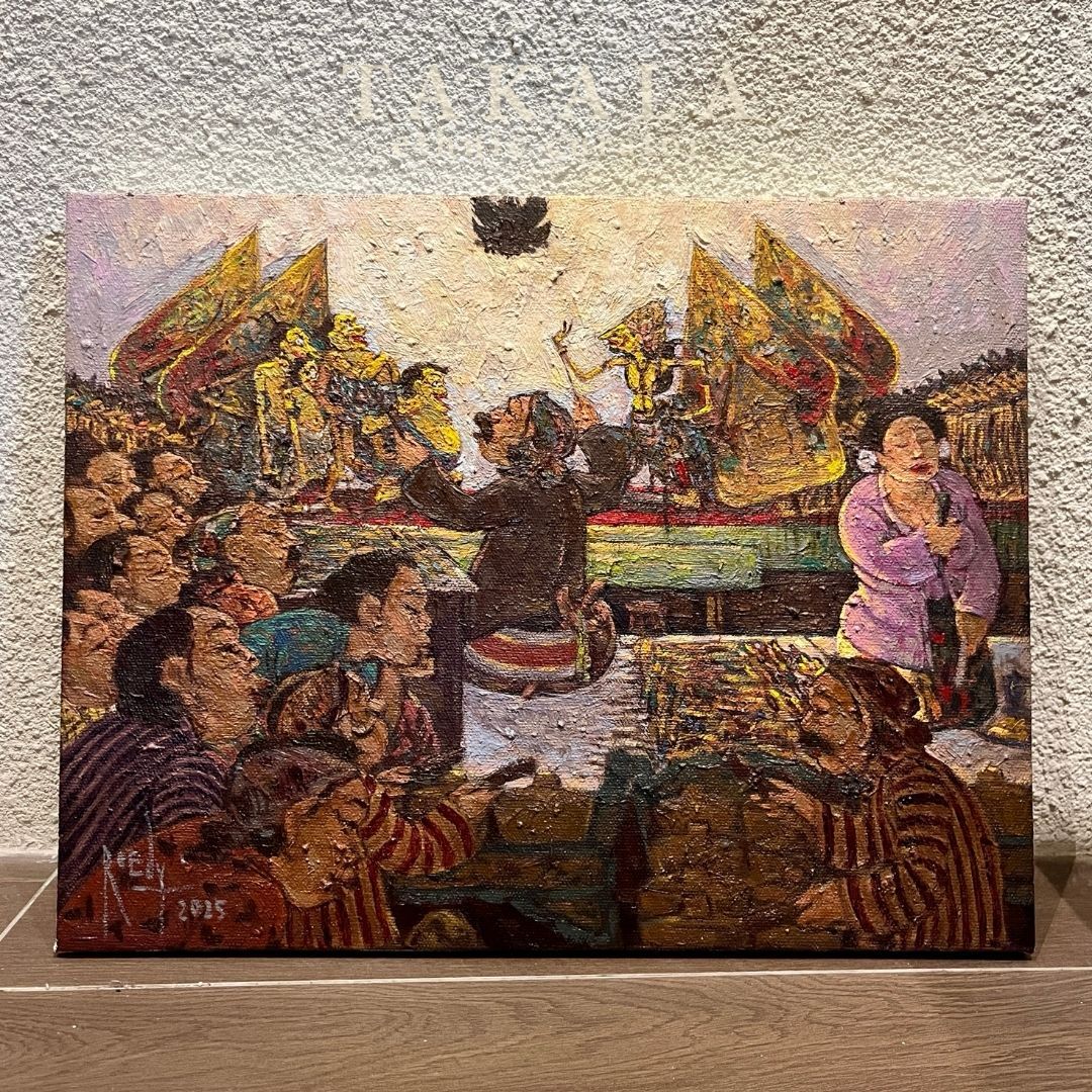 This expressive oil painting titled “Opo Yo Iso” captures the vibrant atmosphere of a Javanese Wayang performance. The scene unfolds with a dalang (puppet master) at the center, passionately bringing shadow puppets to life while surrounded by musicians and an enthralled audience. The textured brushstrokes and warm palette convey the movement, sound, and emotion of the performance, where storytelling, humor, and wisdom intertwine. Through the artist’s vivid depiction, the painting not only celebrates the cultural richness of Wayang but also reflects the communal spirit that continues to define Javanese tradition.