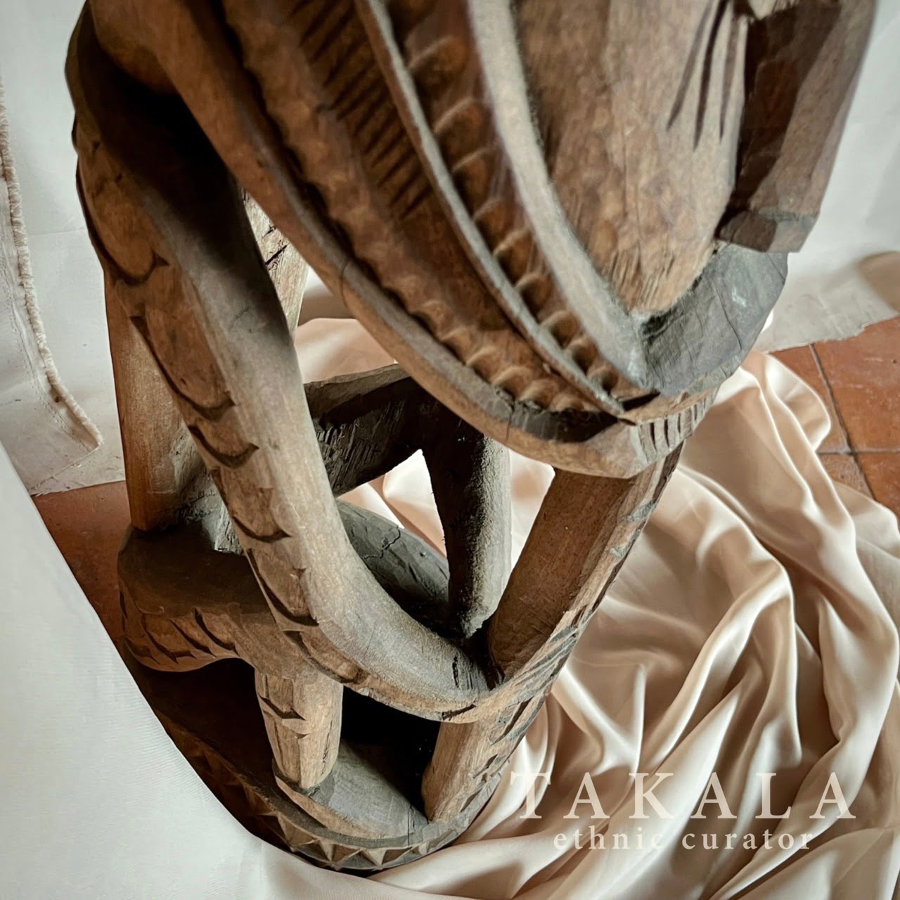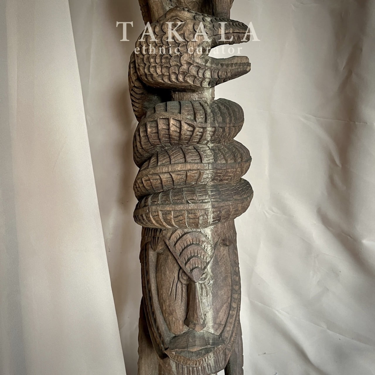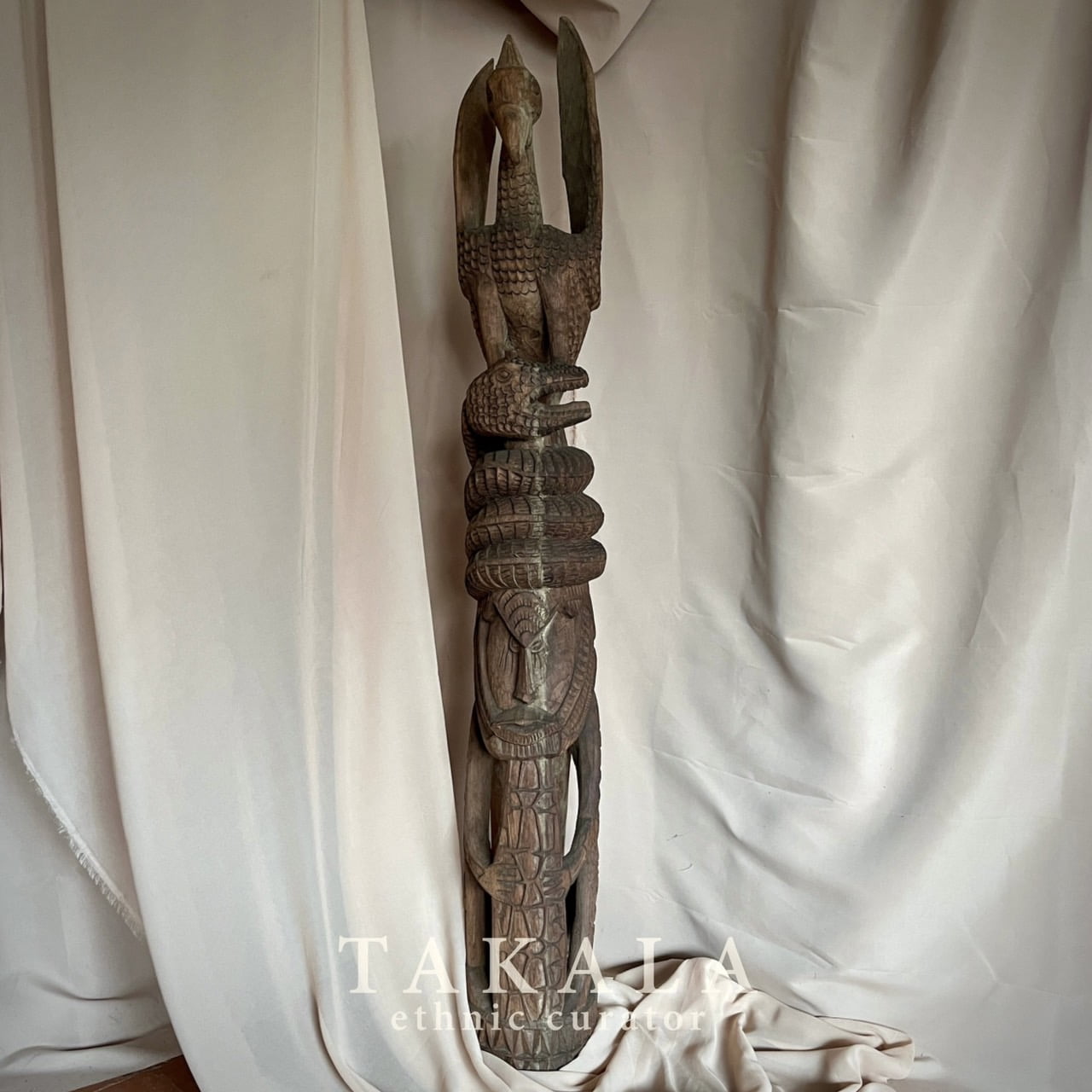 The Asmat tribe consistently portrays their daily life through symbols like headhunting, warfare, and depictions of their ancestors. These representations serve to honor and appease their forebears, driving them to craft intricate and high-quality designs in various forms, including detailed carvings featuring animals such as birds, snakes, and crocodiles, alongside ancestral figures.