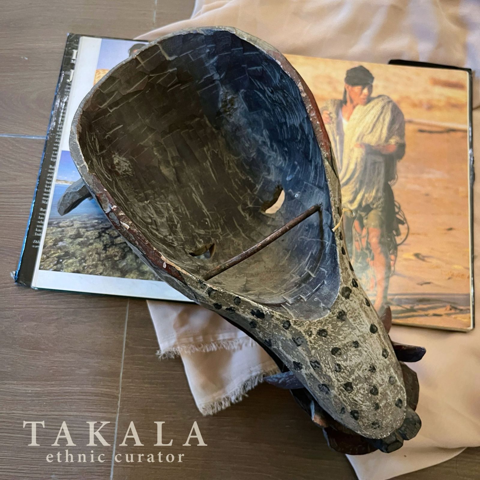 Hudoq is a traditional ritual mask of the Dayak Bahau people from East Borneo. The name Hudoq means “incarnate,” referring to ancestral and sacred beings that descend to bless the earth with fertility. Worn in the Hudoq dance at the start of the planting season or after harvest to drive away crop pests, ask for protection, and give thanks to the ancestral spirits. Hudoq masks portray a mix of pests and dangerous animals that threaten rice plants, such as birds and pigs, along with eagles symbolizing harvest protectors and human faces for ancestors. This particular mask depicts a pig, one of the main animals believed to damage crops.