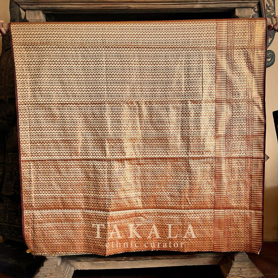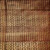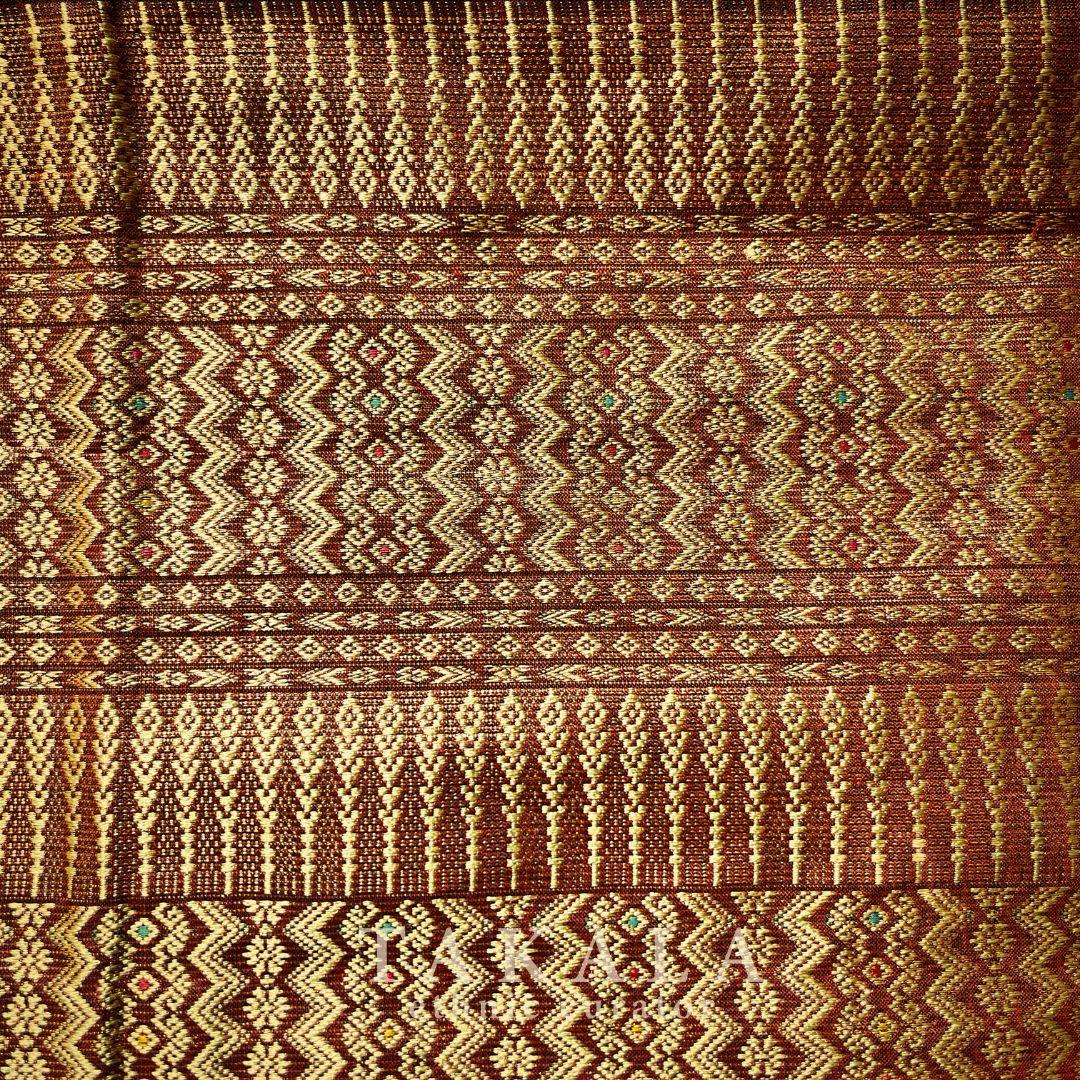 Lombok’s woven songket boasts dual usability for day and night. Combining the popular Subahnale motif with Alang along the edges, Subahnale features decorative flower-like patterns surrounded by geometric motifs resembling beehives, known as kurungan. The interconnected motifs, placed in a scattered pattern, create a rich tapestry. Meanwhile, Alang draws inspiration from the Sasak tribe’s post-harvest storage, symbolizing prosperity. The quality of this textile is defined not only by its base material but also by the thickness of the threads used in the weaving process. This particular piece is made with thicker, triple-layered threads, resulting in a denser structure and a more substantial feel. The layered use of gold threads creates a subtle shimmering effect, enhancing its depth and giving the fabric a refined, luxurious finish.