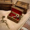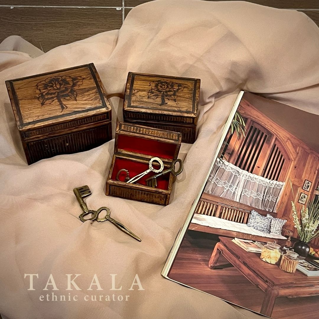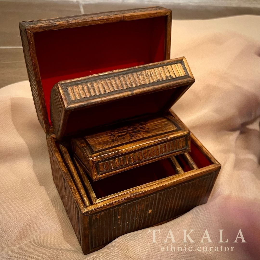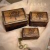 This set consists of three wooden boxes that can be neatly nested within one another. Each box is finely crafted with carved wooden panels, and the outer surfaces are adorned with subtle engraved lines and floral motifs, adding a touch of refinement to their rustic charm. Inside, the boxes are lined with rich red velvet, offering both protection and contrast to the natural wood tones. This luxurious lining hints at the boxes’ use as containers for jewelry, keepsakes, or other treasured items.