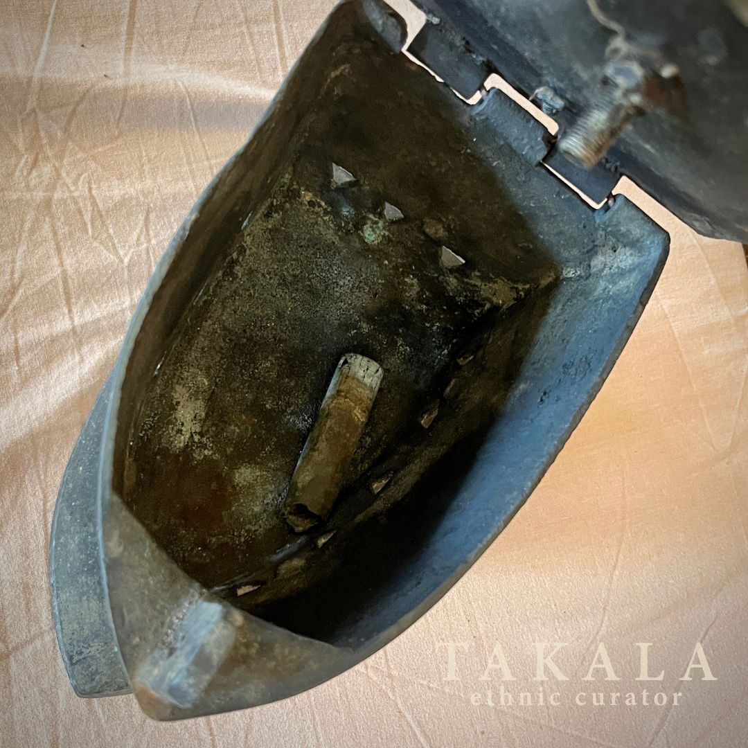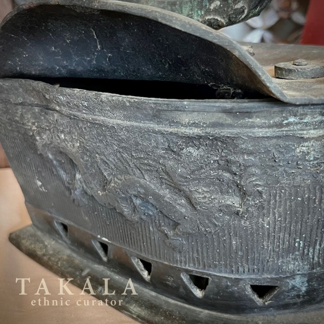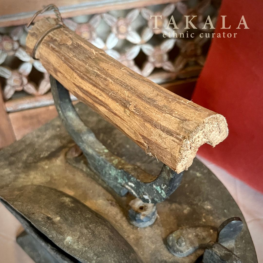 Coal iron with a wooden handle and intricate Chinese dragon carvings on both sides reflects the era when Indonesians used coal irons to press their clothes, particularly in regions like Sumatra and Java. In Chinese culture, the dragon is a powerful symbol of strength, prosperity, and good fortune, often associated with imperial authority and protection. The presence of dragon motifs on household items like this iron not only added artistic beauty but also conveyed blessings of success and harmony. In traditional Peranakan-Chinese culture, household items like cloth irons, bedding sheets, tea sets, and chopsticks were commonly given as gifts to newlyweds, embodying wishes for a harmonious and prosperous married life.