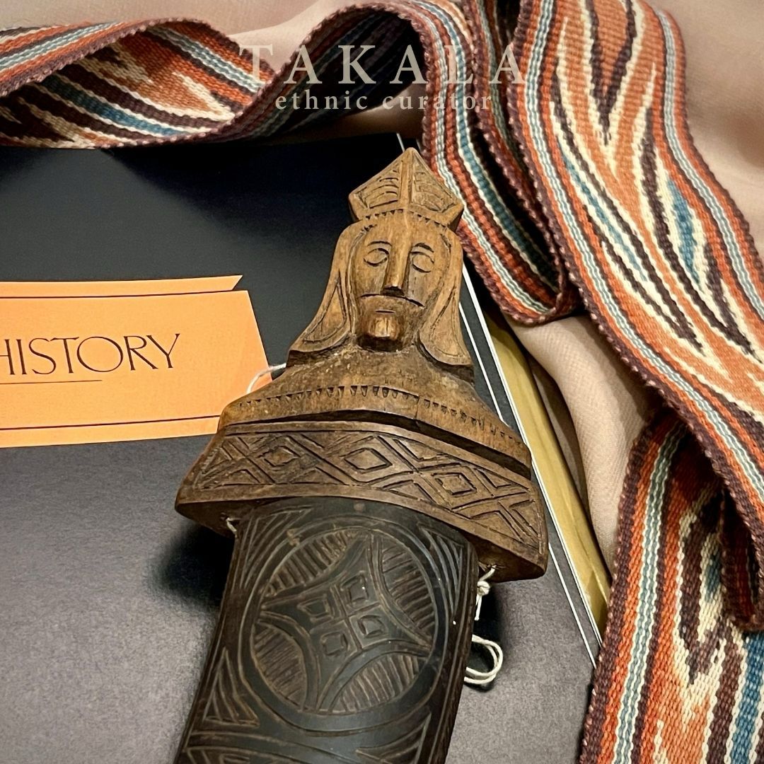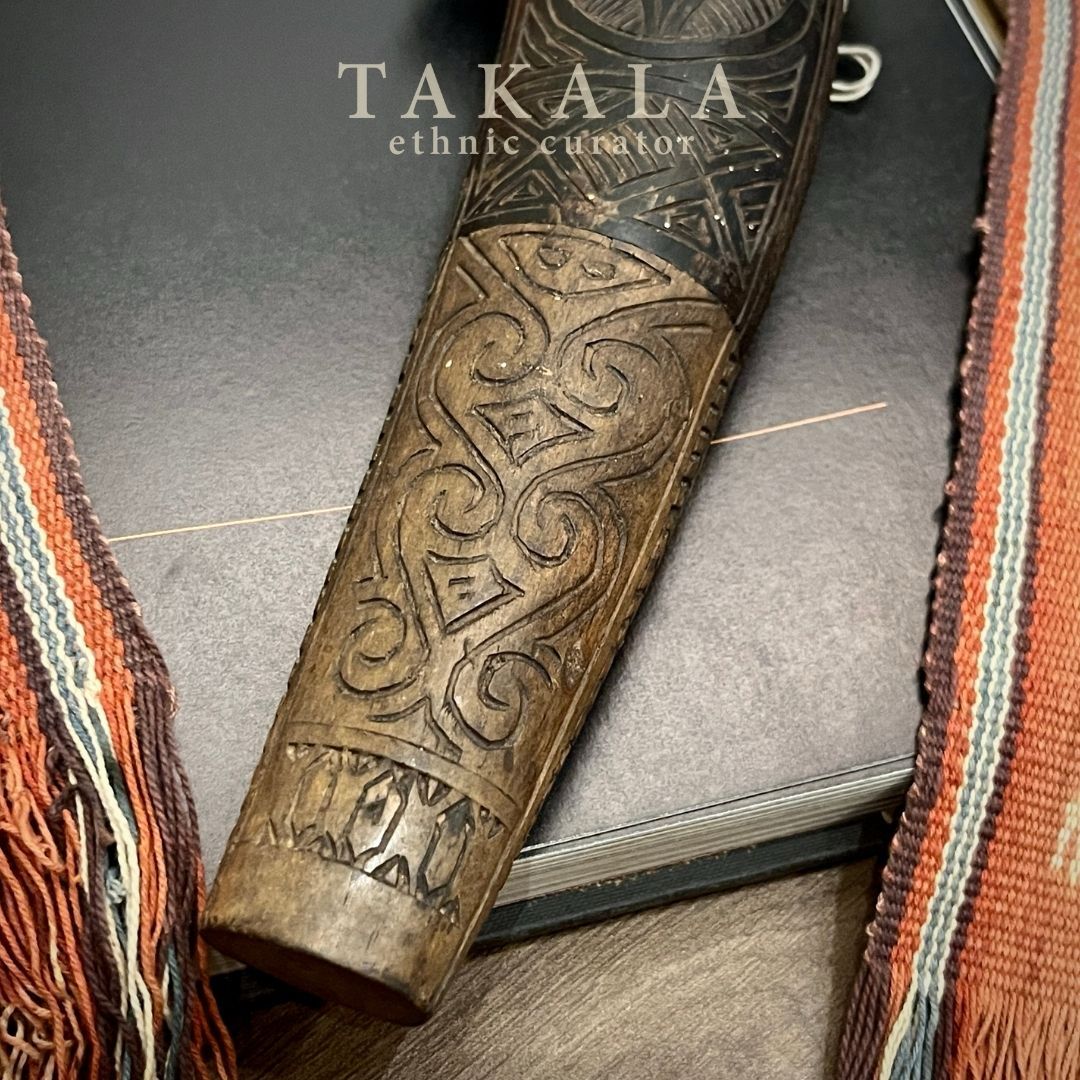 A traditional Toraja medicine and jewelry container, carved from genuine domestic buffalo or cow horn. The main body is made from horn, while the stopper and base are crafted from wood. The upper section features a carved ancestor figure, embodying protection, strength, and the Torajan reverence for lineage. Containers like this were used to store traditional medicines or precious items, symbolizing both practicality and spiritual connection. The use of buffalo horn, a material deeply valued in Torajan culture, represents wealth, endurance, and the enduring bond between humans and nature.