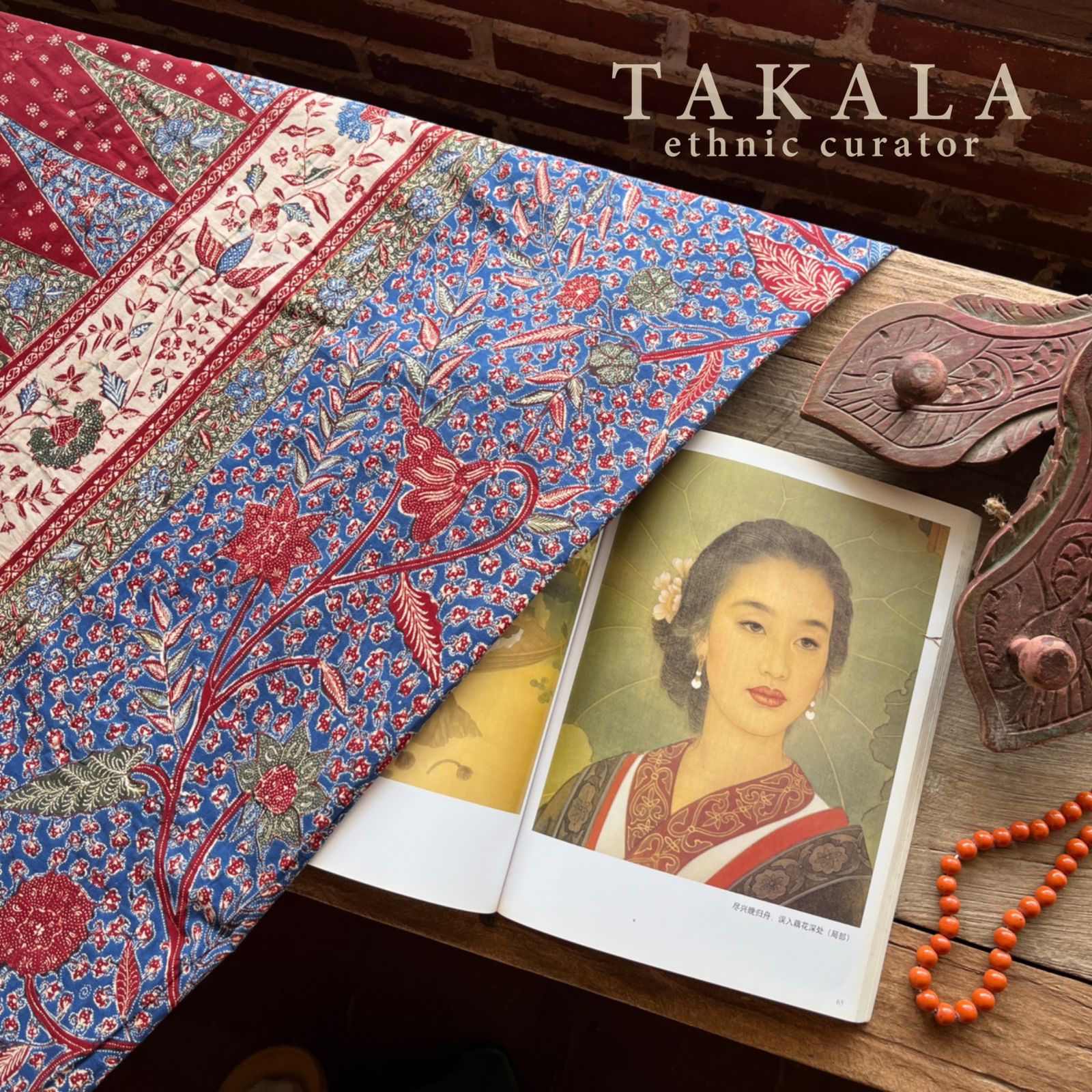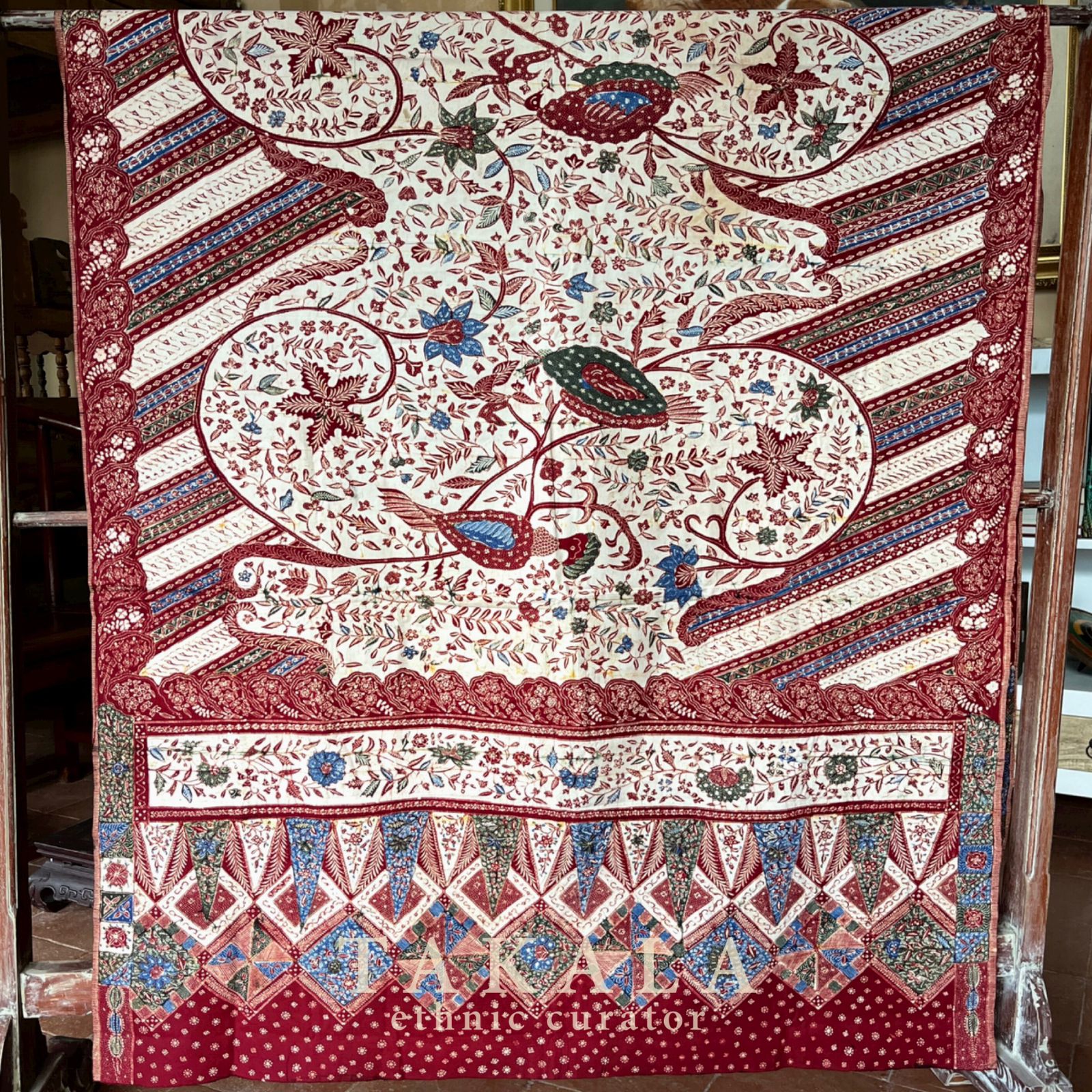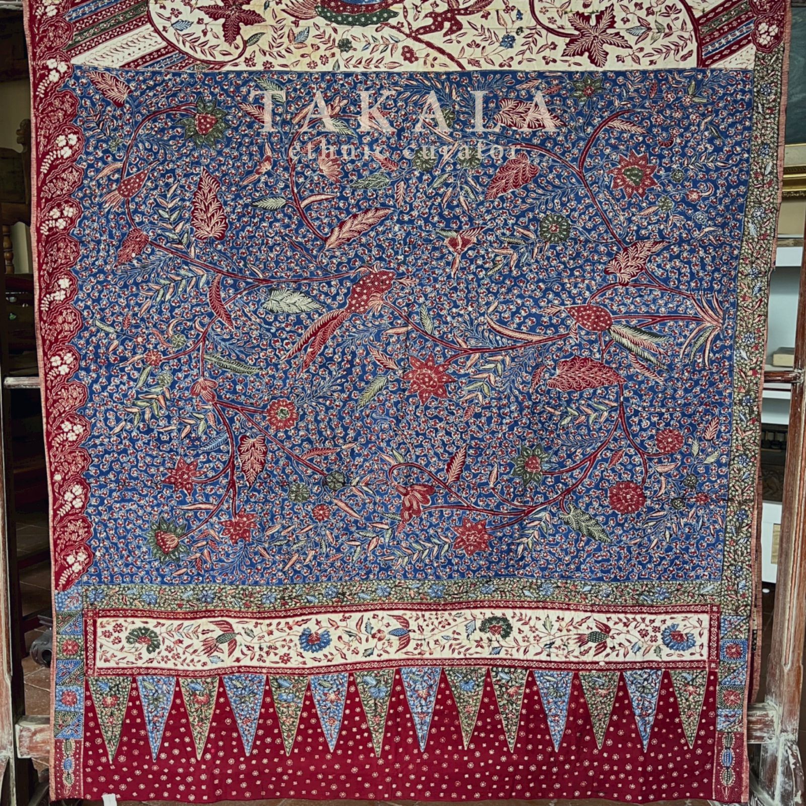 The term “tumpal” originates from the Javanese language, meaning ‘tip’ or ‘end’. History mentions that the decorative motif of tumpal has existed since the time of the kingdoms in Indonesia and is commonly found along the northern coast of Java island. Tumpal holds a philosophical meaning in accordance with the concept of cosmic unity, microcosm (human), macrocosm (universe), and metacosm (the ‘other’ realm) from worldly attributes towards divinity. This batik is combination of Pagi Sore batik with the Geblok Kasur motif symbolizing cleanliness, and the Lereng motif representing the courage to face challenges with distictive Lasem’s red and blue colors.