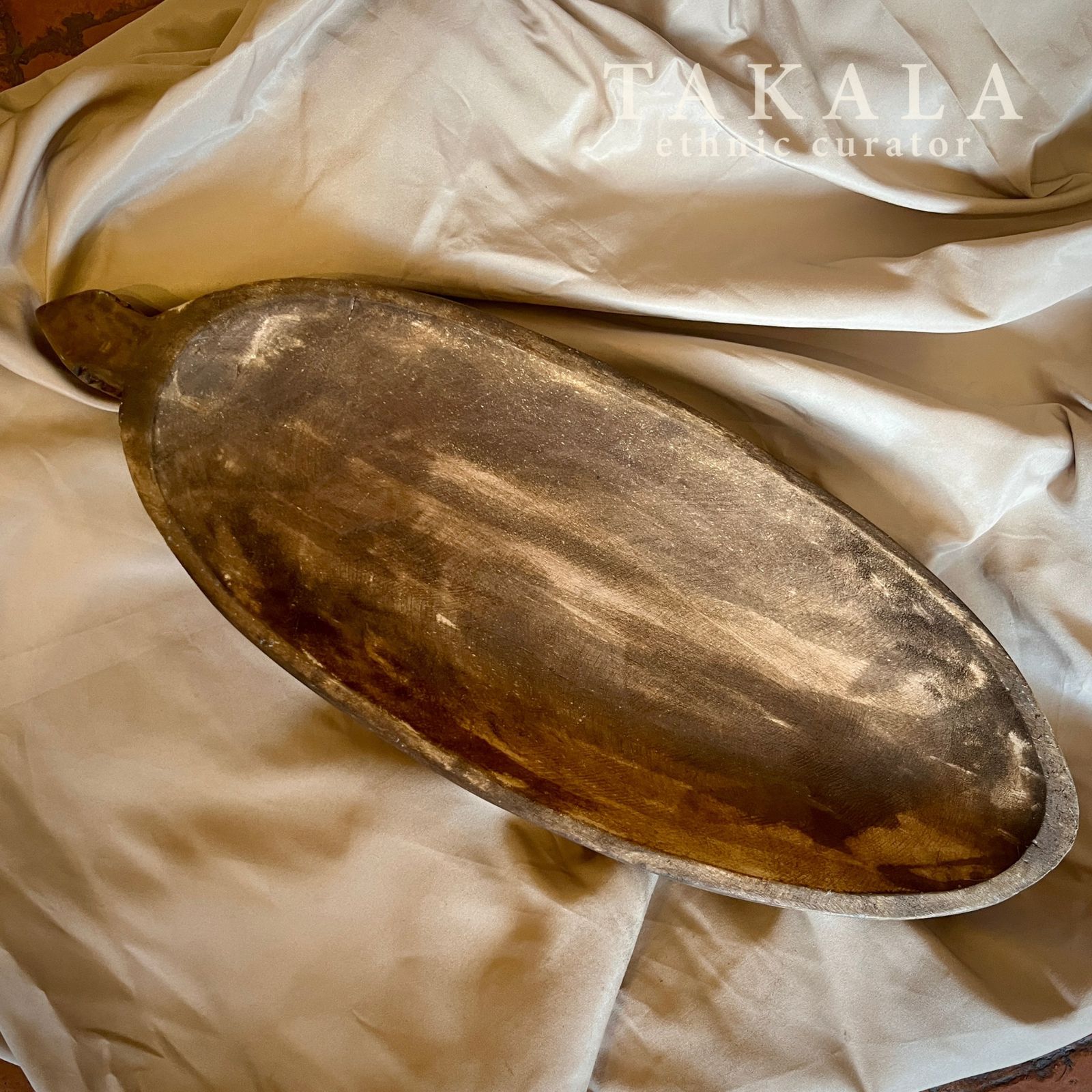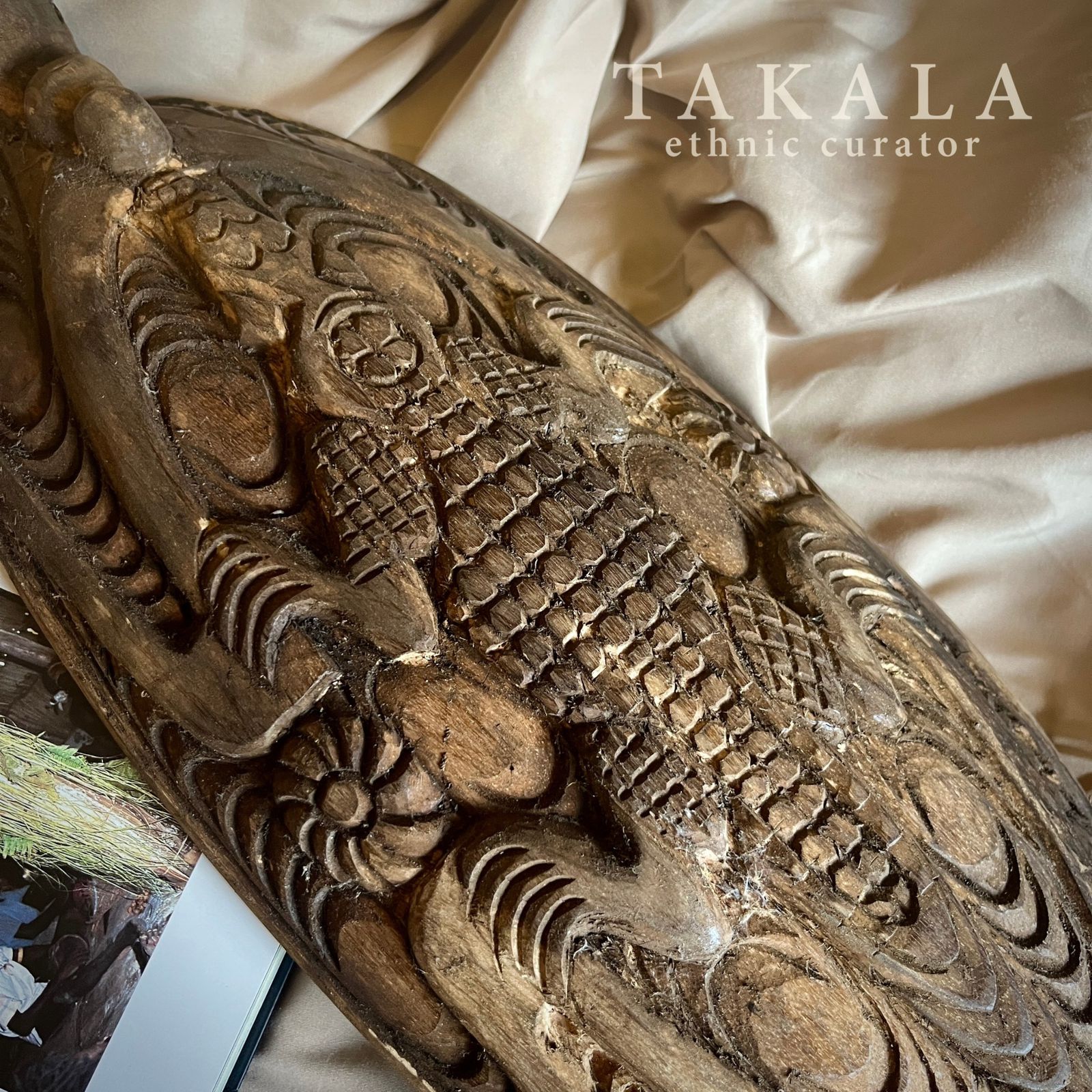 Turtle Sago Plates are commonly found in Asmat wood carving. The turtle head is usually carved at the tip of the plate, it features crocodile carving that symbolizes strength and ancestral connections in Asmat culture. According to Asmat mythology, the god Fumeripitsy defeated a giant crocodile but was badly injured. A compassionate flamingo nursed him back to health, after which he carved two statues and created a drum. As he danced, the statues came to life, becoming the first ancestors of the Asmat people. Used during festivals and ceremonies, it often served to hold sago worms, symbolizing the transfer of ancestral power. In Asmat rituals, particularly in an ceremony, sago containers play a central role in fostering unity and reconciliation between families after a head hunting practice.