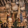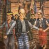 This painting depicts a Dayak community performing a sacred dance during the Tewah ceremony inside a traditional Rumah Betang. Tewah is an important mortuary ritual in the Kaharingan belief system, the indigenous religion of the Dayak, centered on guiding the soul of the deceased to the spiritual realm and honoring ancestral spirits. Kaharingan reflects a deep connection between humans, nature, and the unseen world, where rituals, offerings, and dance play essential roles in maintaining cosmic balance. The dancers are adorned in elaborate ceremonial attire, often featuring feathered headdresses, intricate beadwork, and symbolic ornaments that represent protection and spiritual identity. Set within the long communal space of the Rumah Betang, the dance becomes a collective expression of grief, respect, and continuity between the living and their ancestors, transforming mourning into a shared spiritual journey.