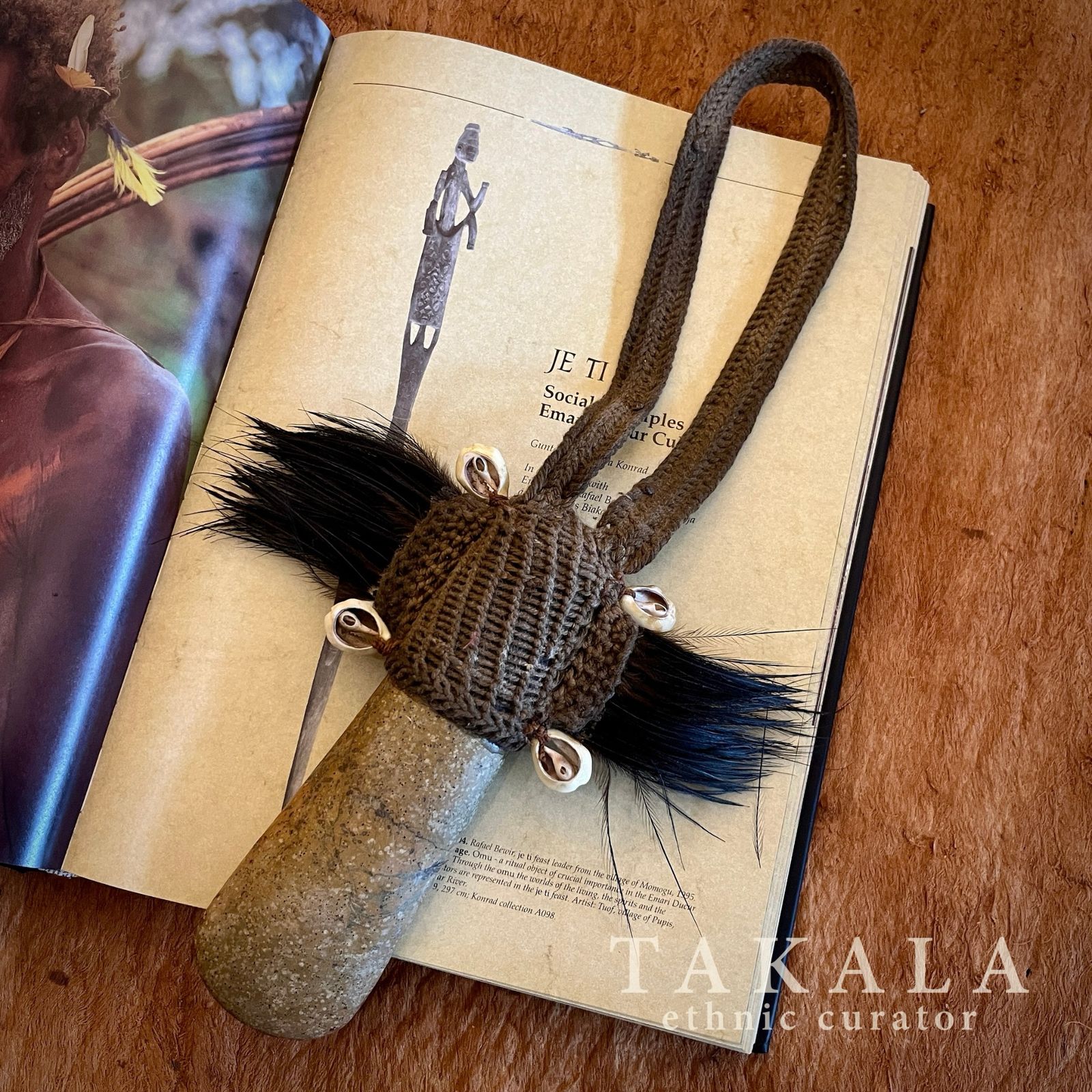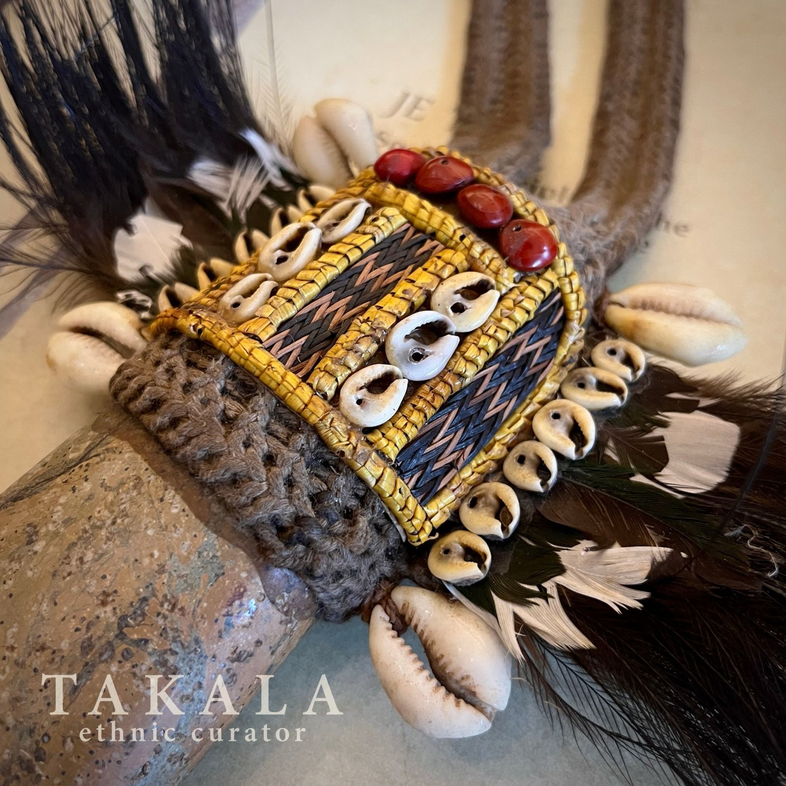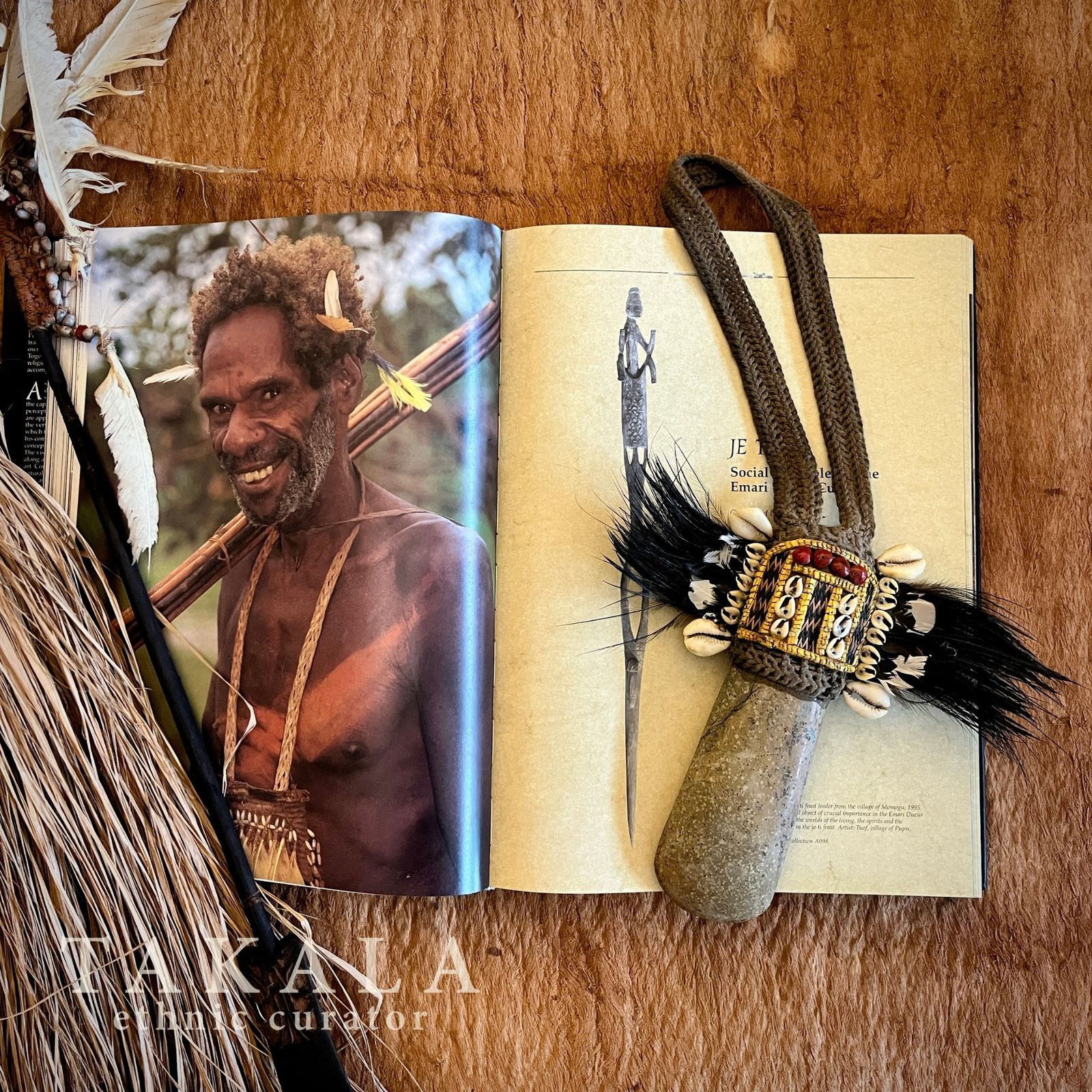 Materials: Woven threads, White Papuan jade, Cassowary feathers, White cockatoo feathers, Red orchid seeds, Nassa shells, Shells, Woven bark, Orchid Stems