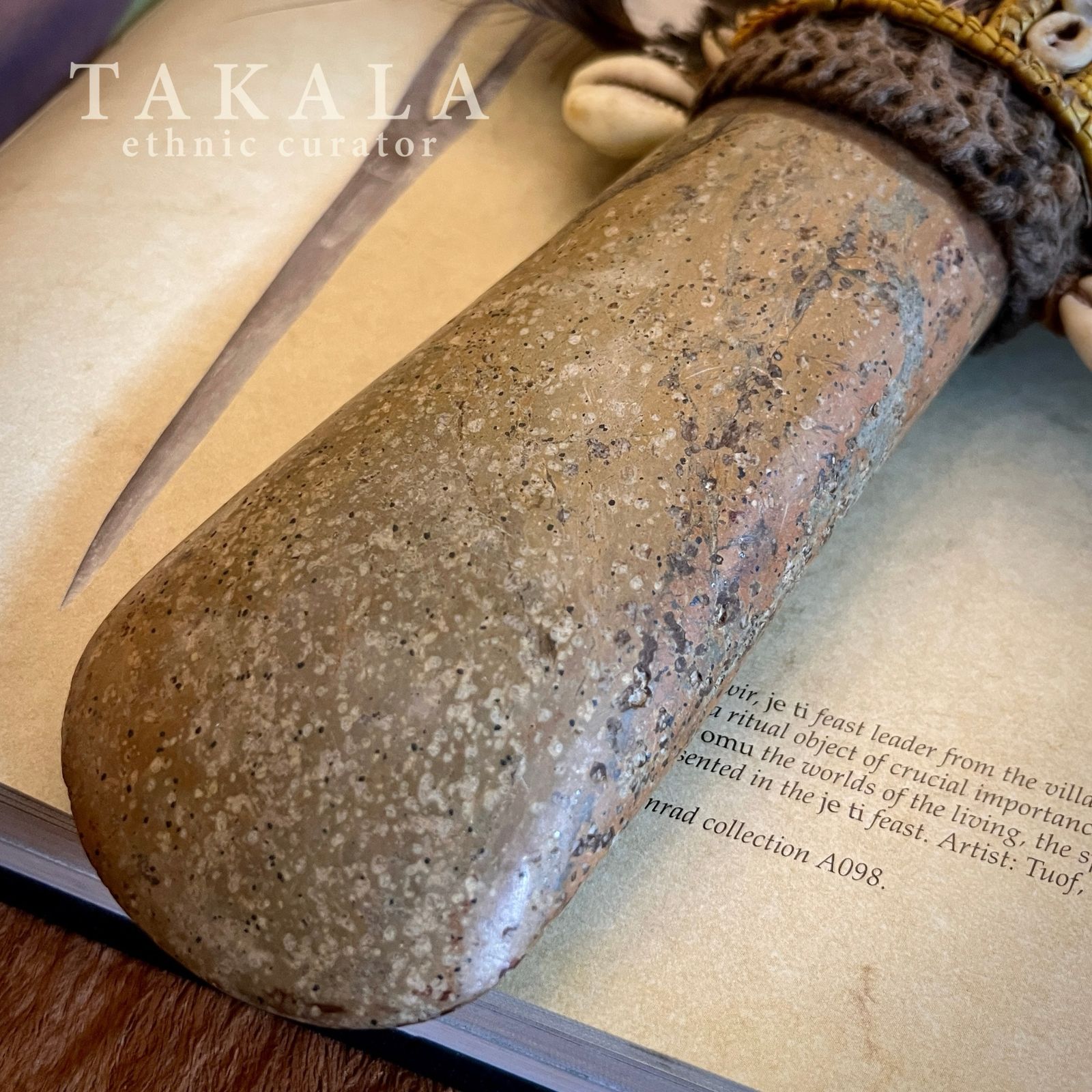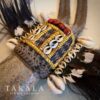 This tribal necklace from Papua serves as a status symbol for warriors or tribal chiefs. The pendant is made from polished natural white Papuan jade—also traditionally used as part of a marriage dowry—carved into an elongated form symbolizing strength and protection. The centerpiece is adorned with cassowary and cockatoo feathers, while the middle section is intricately decorated with woven threads, bark fiber, orchid stems, red orchid seeds, and natural shells. Worn across the chest, this ceremonial necklace embodies identity, authority, and a profound connection to the natural world.