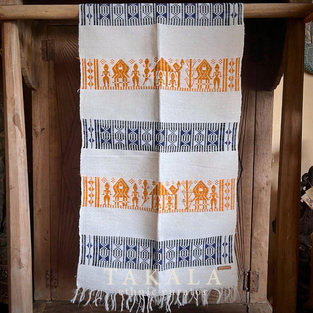 This woven textile tells the story of the Sasak people of Lombok, featuring the Bale, the traditional Sasak house, as a central symbol of home and continuity. The figures represent the Sasak community, who have lived in the village for around 15 generations, preserving their traditions and way of life. Textiles have long played an important role in Lombok’s cultural identity. Made entirely from natural materials, the colors come from traditional dyes: light brown from coconut husk and deep blue from tamarind. Each piece is handwoven on a manual backstrap loom. Compared to textiles from Sade Village that mainly use cotton, weavings from Sukarara Village often use banana or pineapple fiber as the base material, giving them a slightly rougher texture and highlighting the diversity within Sasak weaving traditions.
